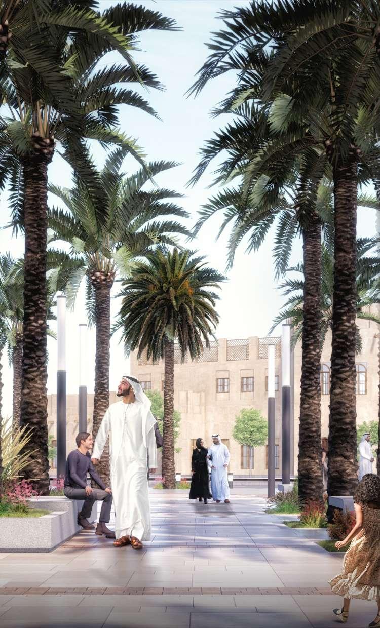 The designs of the past, their heritage, character, and the quality of life they reflect, are interpreted and integrated into a vibrant street environment, incorporating stalls, traders, markets and souqs. This reflects an authentic Emirati experience, utilising sustainable natural solutions to provide comfort and landscaping for those experiencing and viewing the transformation. Three key principles underline the design philosophy. To value the existing, define the missing and nurture the possible.