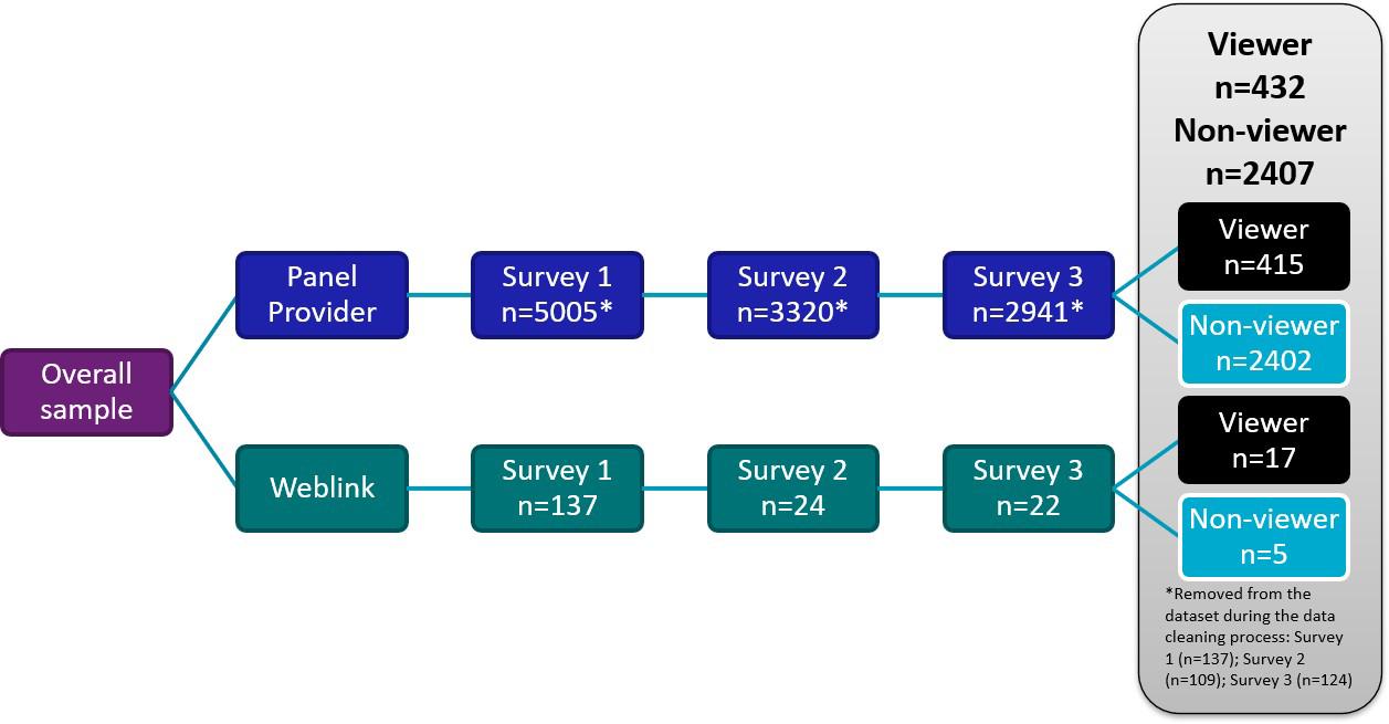 Before completing the surveys, all participants were required to give explicit informed consent to take part in the surveys (see Appendices A.1.1 and A.1.2 for participant information sheets and consent forms for ‘viewer’ and ‘non viewer’ groups, respectively). A small number of ‘screening questions’ were also asked upfront (see Appendix A.1.3) to assess prospective participants against the study’s eligibility criteria and assist with meeting quota targets. As shown in the Appendix A.1.4, the online surveys included a range of question types and formats – including Likert rating scales, categorical items (e.g. single select and multi select checklists), and numerical questions.