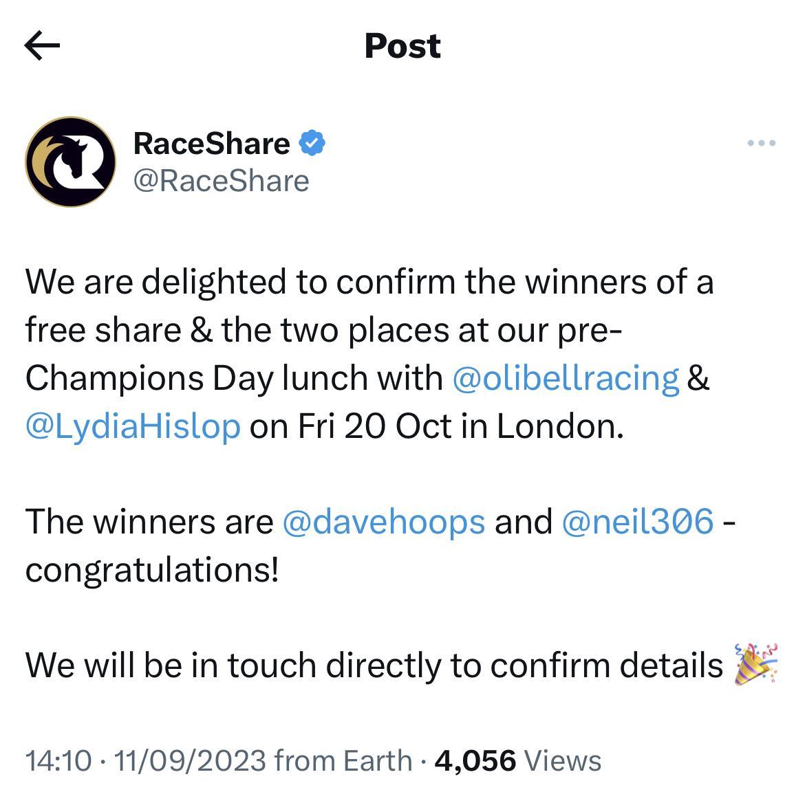 At RaceShare, we have tried to have as many competitions as possible during the course of our ļ¬rst year, which have included an all expenses paid trip for two to the Dubai World Cup in March and free shares in our team of Flat horses during Derby week. Our latest competition comprised a chance to win a place at lunch in London with Oli Bell and Lydia Hislop on the day before British Champions Day at Ascot.