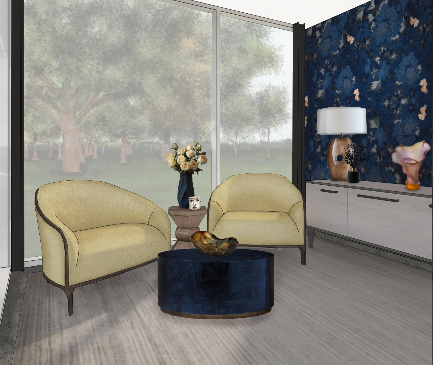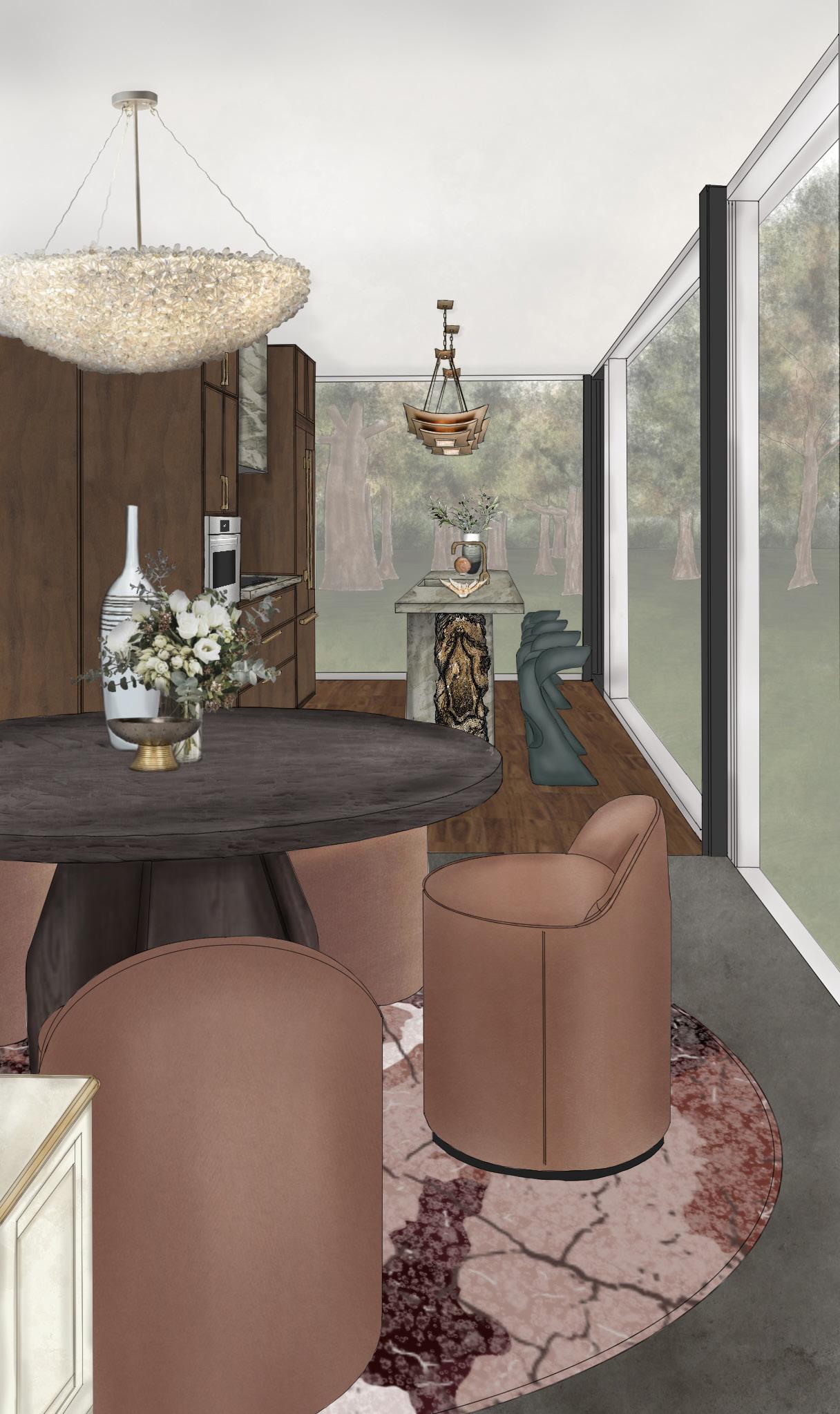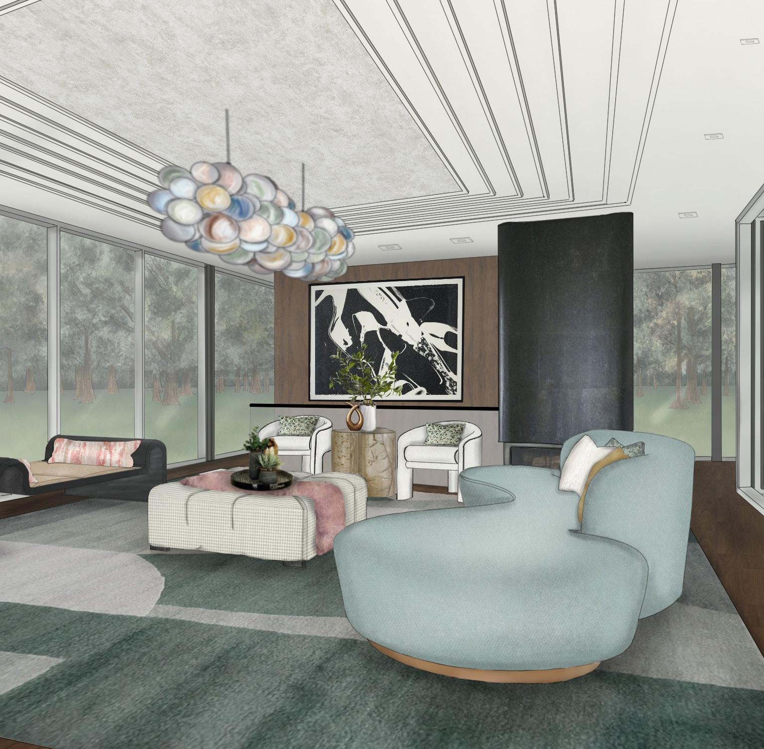 Sahara Rose’s new glass house in the woods will celebrate the beauty and richness of the area around it. What was once a simple glass shell now includes intentional furnishings and thought-out details. Each selection and the combinations convey a feeling of luxury, peace, and boldness that aligns with the needs of the client. Featuring Well Design guidelines, toxic-free spaces, and meditation spaces, this space is grounded and serves as a healing retreat for Sahara.