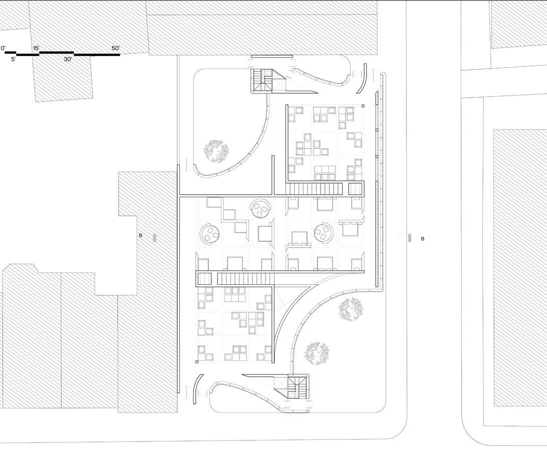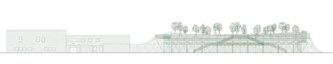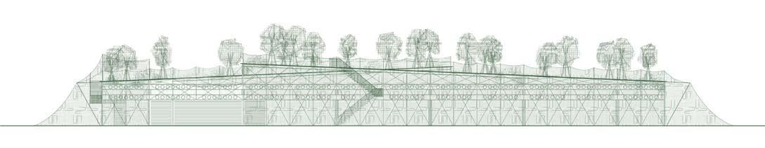 From the natural ground, the project steps down 5 feet for each band of production. Metal mesh and timber deck structures continue flush to natural ground as a circulation above excavated ground bringing the peripheral public space into the structure and allowing for an extension of the living space from the homes.