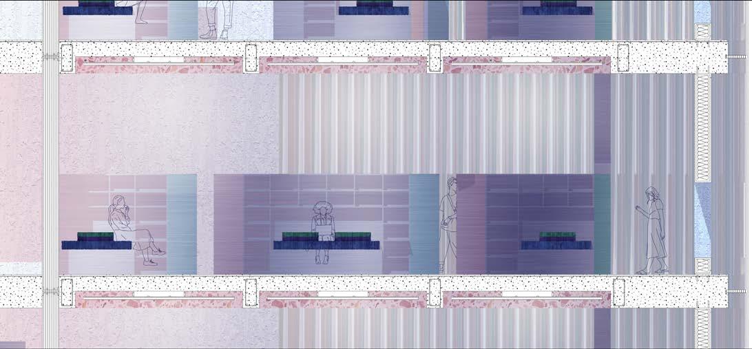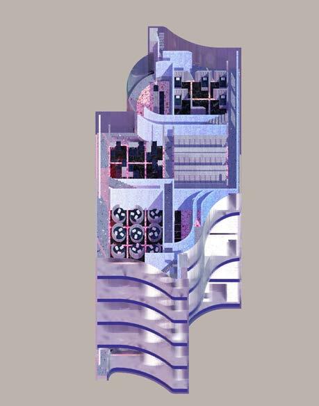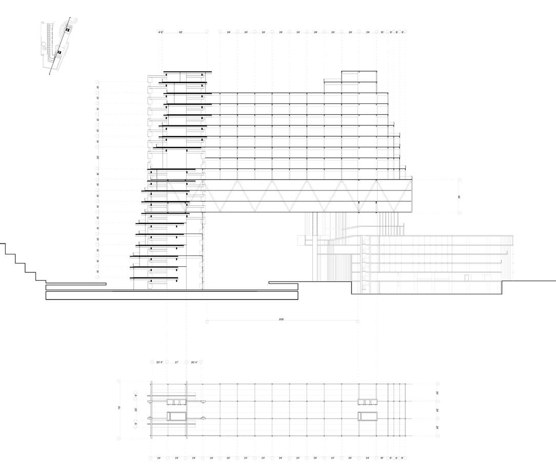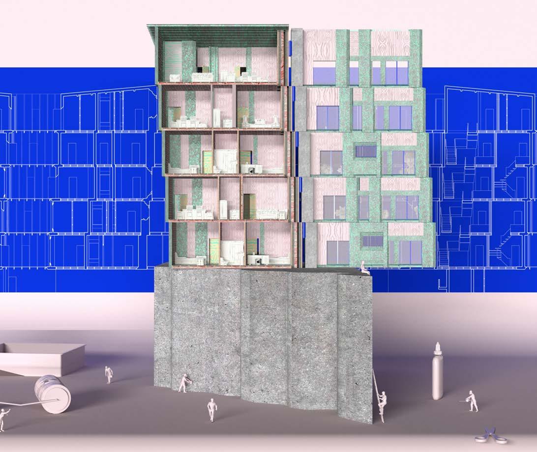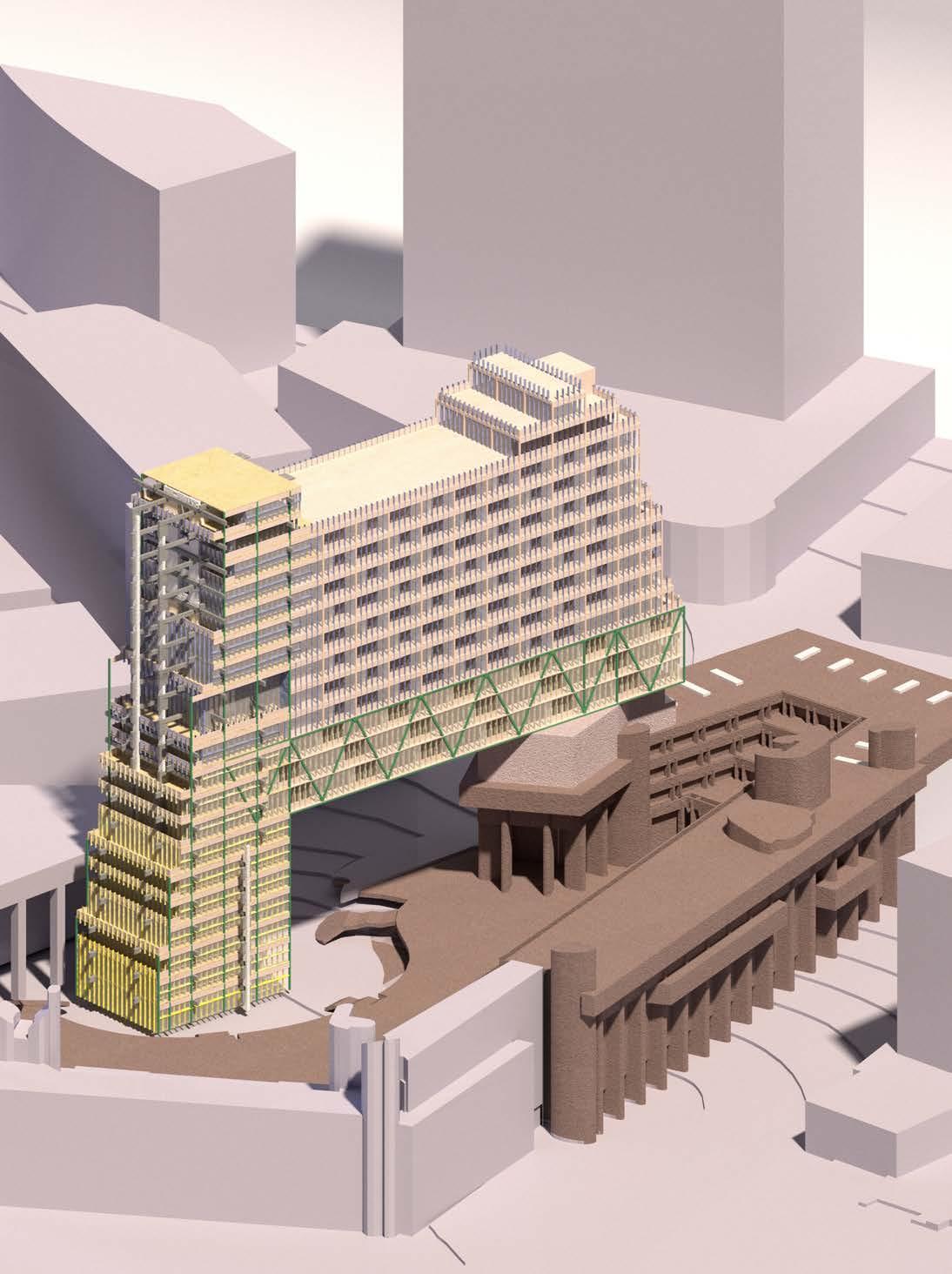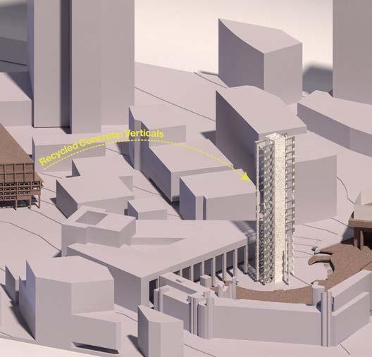 Our recycled concrete tower is complemented by a mass timber system that balances the heaviness of the structure and positions the material as a contemporary alternative to poured in place concrete. Just as we are advocating for a radical rethinking of material reuse and disassembly, this additional system advocates for a radical adoption of a sustainable building material. The two systems are spanned by a three story steel truss, and the crux of our design comes from the synthesis and interactions between the three systems.