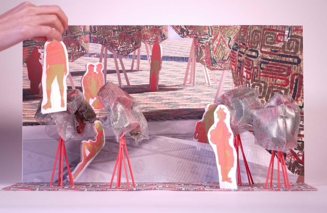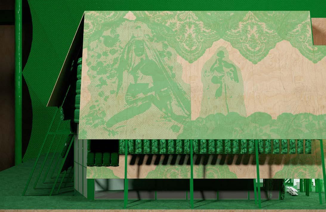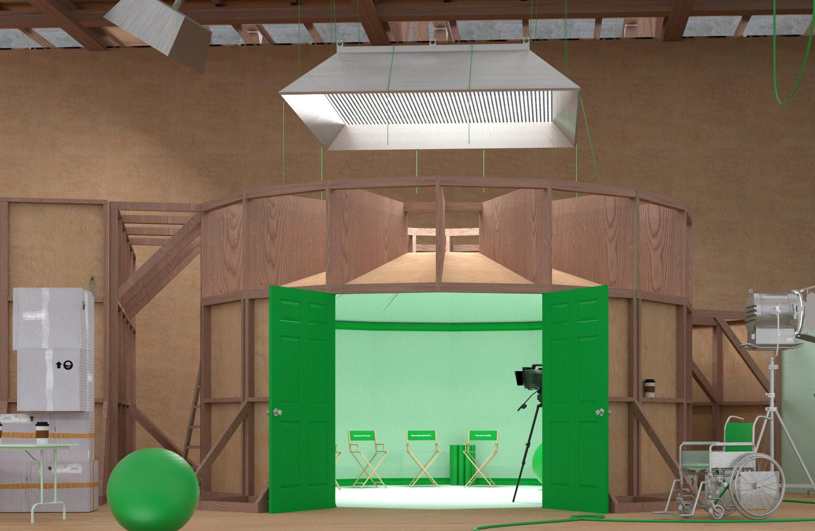 I added a donut of medical space around the existing soundstage that punctures into the filmic space on one side. The structure of the flexible medical and filmic spaces grows out of the informal logistics of the stage flat. The stage flat expands in the buildings facade and structure, creating a series of layered skirts of wooden billboards that peel away from the building’s mass. The design of the medical and theatrical space is determined by shared needs for ventilation and sound control which express themselves as a soft underskirt in the facade. Stuffed plastic pillows–filled with the significant textile waste of the production industry–drape down from the billboards for sound isolation.
