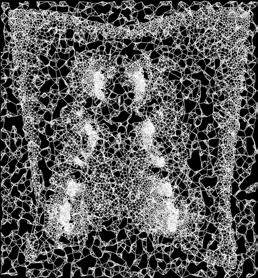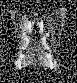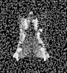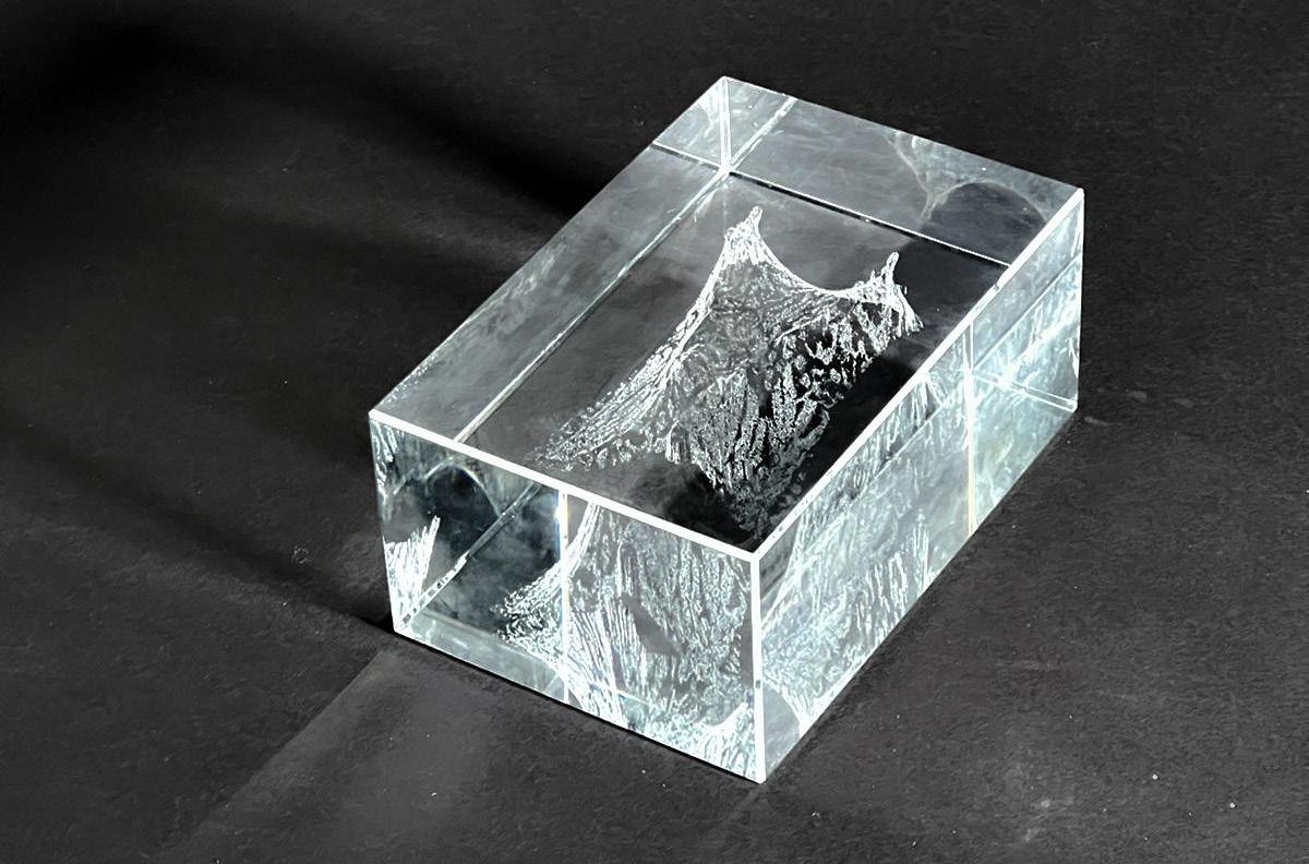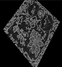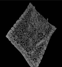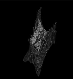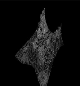 Through a series of translations structural nets derived from this tension map were fed into a custom neural network trained on the bobbin lace collection of the Cooper Hewitt’s collection. The resulting object was a controlled latent walk type animation where AI information was determined by a structural analysis and a physical object where the shroud takes on its 3D form etched into a crystal block.