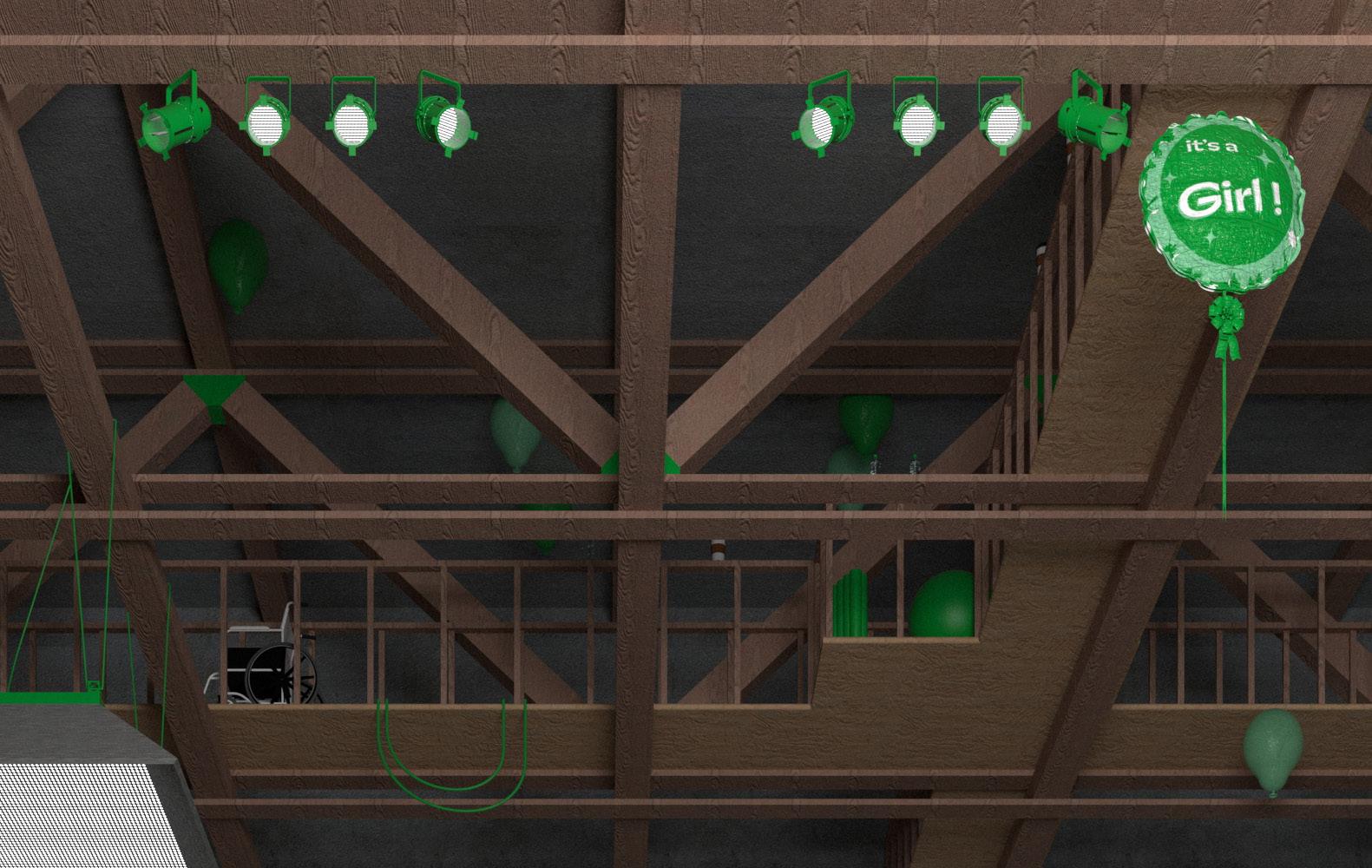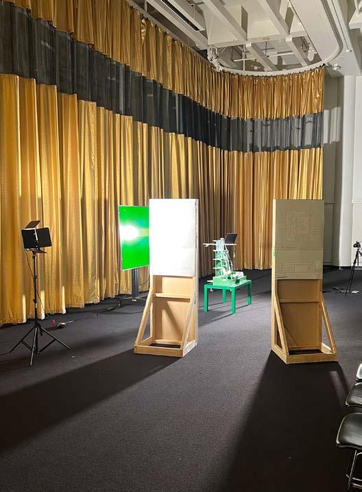 The presentation of my thesis occupied an expanded theatrical field of my project–complimented by studio lights, cameras, and full scale stage flats. The project is about the creation of images and creates its own images.