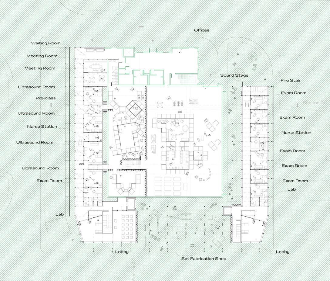 Ground floor plan showing medical donut massing around the existing sound stage