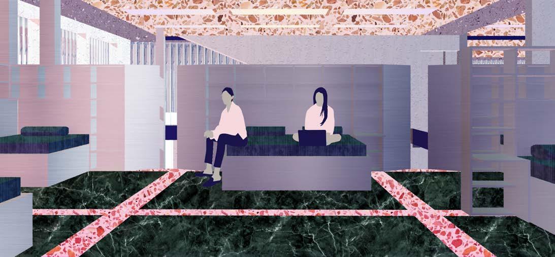 The three bed types--center aligned (2 users), corner aligned (1 user), and circular (3 users)--create different office environments within the nine square. Additionally, a play of delaminating interior facades interacting with an offset glass skin separates the restful interior world from the bustling street and control degrees of visibility.