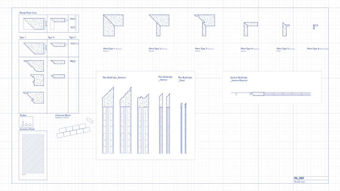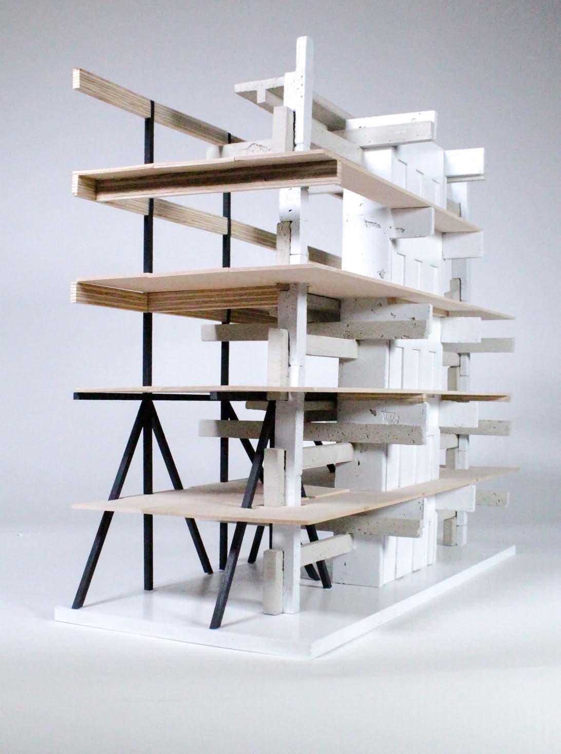 I explored how structural materials transform from Baudrillard’s reflection of reality stage into pure simulacrum and through this arrived at our for the veneerification of materiality–the application of a sign of a material to a physical material. In applying the mitre and ornamental cut, both accomplished with chain saws and concrete saws, to the section of three readymade precast elements we curated enough variety to negotiate the transitional wall thickness of interior to exterior and distinguish between public and private space.