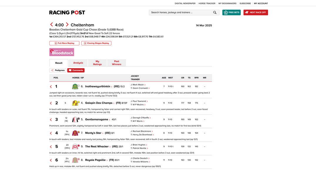 Comprehensive racecards and results, in-running comments, form, RPR ratings, betting forecasts, and detailed profiles of horses, trainers, owners, and jockeys.