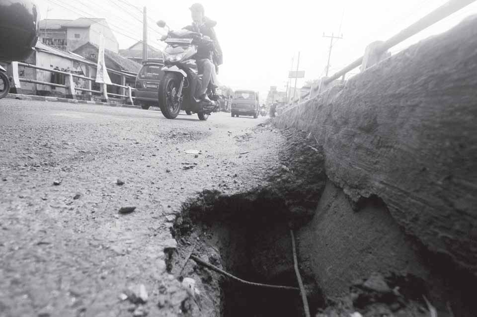 CIAMPEA–Lubang menganga di Jembatan Cinangneng, Kecamatan Ciampea, Kabupaten Bogor, membahayakan pengguna jalan. Lubang menganga di jembatan penghubung Kecamatan Dramaga dan Ciampea itu masih dibiarkan rusak. Hingga Senin (22/7) pagi, belum ada perbaikan atau penutupan sementara, lubang di jembatan tersebut. Pantauan Radar Bogor, lubang menganga masih terlihat di lokasi. Tidak ada penutupan atau pemberian tanda bagi pengendara bahwa ada lubang menganga di jembatan tersebut. Sementara itu Camat Ciampea, Pardi mengaku pihaknya belum mengetahui adanya lubang menganga di jembatan Cinangneng. “Belum dapat laporan,” kata dia kepada Radar Bogor , Senin (22/7) pagi. Lanjut Pardi, pihaknya akan segera melakukan pengecekan ke lokasi untuk menjadi bahan laporan kepada instansi terkait perihal perbaikan jembatan tersebut. “Nanti dicek dl ke lapangan sebagai bahan koordinasi dgn dinas terkait,” tukas dia. Diberitakan sebelumnya, Jembatan Cinangneng, penghubung Kecamatan Dramaga dan Ciampea kondisinya rusak. Terdapat lubang menganga di beberapa bagian jembatan tersebut. Pantauan Radar Bogor, Minggu (21/7) Pagi, ada dua titik lubang menganga di Jembatan Cinangneng tersebut. Dua lubang itu berada di bagian kiri jembatan(dari arah Ciampea menuju Dramaga). Lubang pertama memiliki ukuran sekitaran 25 sentimeter. Kondisi besi beton jembatan terlihat menganga. Tembus ke bagian bawah jembatan. Satu lagi, berikutnya sekitar 15 sentimeter. Kondisinya serupa. Selain lubang yang menganga di beberapa bagian jembatan juga mengalami kerusakan dan beberapa aspal mengalami ambles.(all/c)