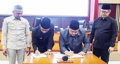 TEKEN: Pj Wali Kota Bogor bersama pimpinan DPRD Kota Bogor meneken penetapan Perda untuk pertanggungjawaban APBD 2023.