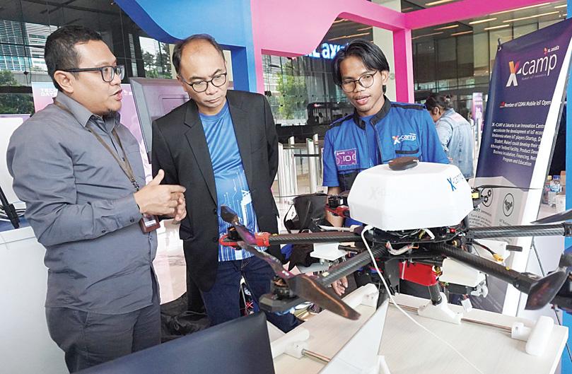 INOVASI: (ki-ka) Chief Enterprise & SME XL Axiata, Feby Sallyanto, Direktur & Chief Technology Officer XL Axiata, I Gede Darmayusa melihat drone yang menggunakan teknologi IoT yang merupakan produk Laboratorium X-Camp pada acara XL Axiata Technology Days 2023 di XL Axiata Tower, Jakarta, Rabu (14/6).