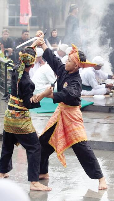 ATRAKSI: Penampilan pencak silat menjadi rangkaian penutupan dalam kegiatan Babakti Ngumbah Tugu Kujang, yang diselenggarakan para Budayawan Bogor, kemarin.