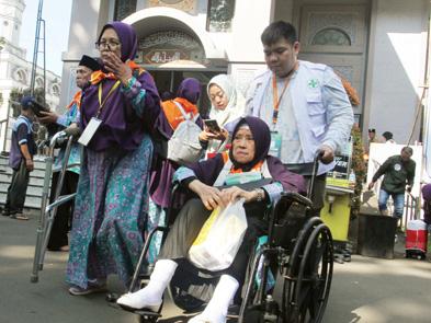 DIDOMINASI LANSIA: Petugas membantu calon jemaah haji saat pelepasan di Masjid Raya Bogor.