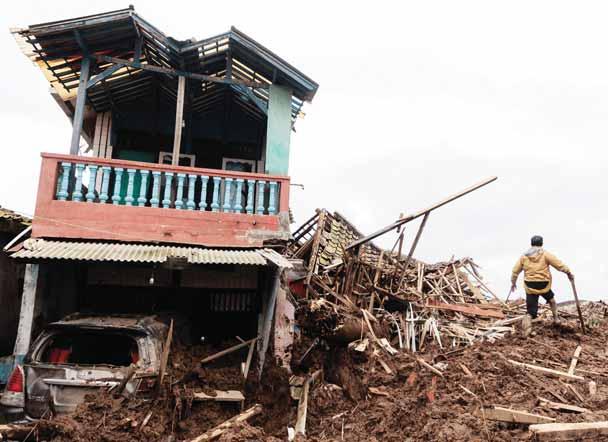 HANCUR: Seorang warga berdiri di puing rumah saat melakukan evakuasi di kawasan bencana longsor di Desa Pasirlangu, Kabupaten Bandung Barat, Senin (26/1).