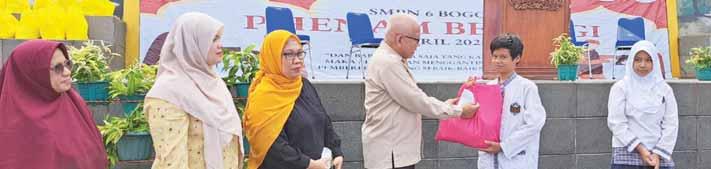 PEDULI: Perwakilan PT SBI Pabrik Narogong menyerahkan santunan kegiatan para peserta safari ramadan yang dilakukan PT SBI Pabrik Narogong untuk anak difabel dan yatim piatu, Selasa (2/4). SEPI: Tampak suasana Terminal Parung yang belum terlihat banyak didatangi calon penumpang atau warga yang akan mudik. DIRUSAK: Pemilik rumah memeriksa barang-barang yang dibobol para pencuri rumahnya. BANGGA: Guru yang memasuki masa pensiun, Emi Sukatmi, mendapatkan apresiasi dan penghargaan dari Camat Cibinong.