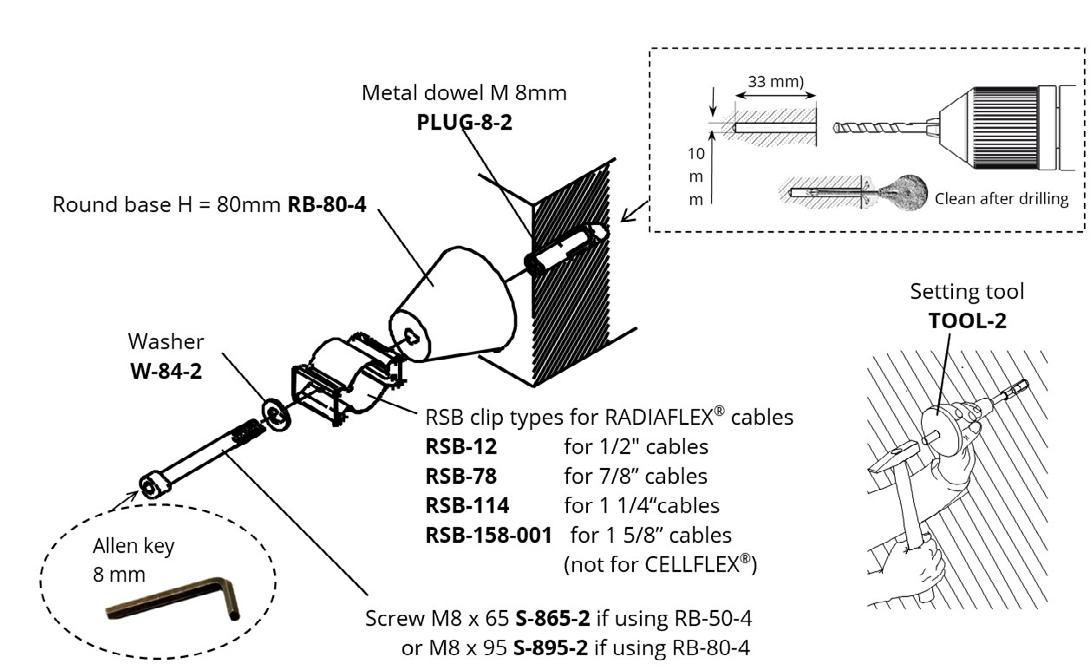 RLK, RAY and RLV type RADIAFLEX cables require a round base with a height H = 80 mm. These clamps are fixed with a plastic plug Ø 6 mm and a stainless steel screw.
