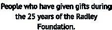 the list of donors is available in the printed edition of the impact report, please contact the radley foundation to request a copy at foundation@radley.org.uk.