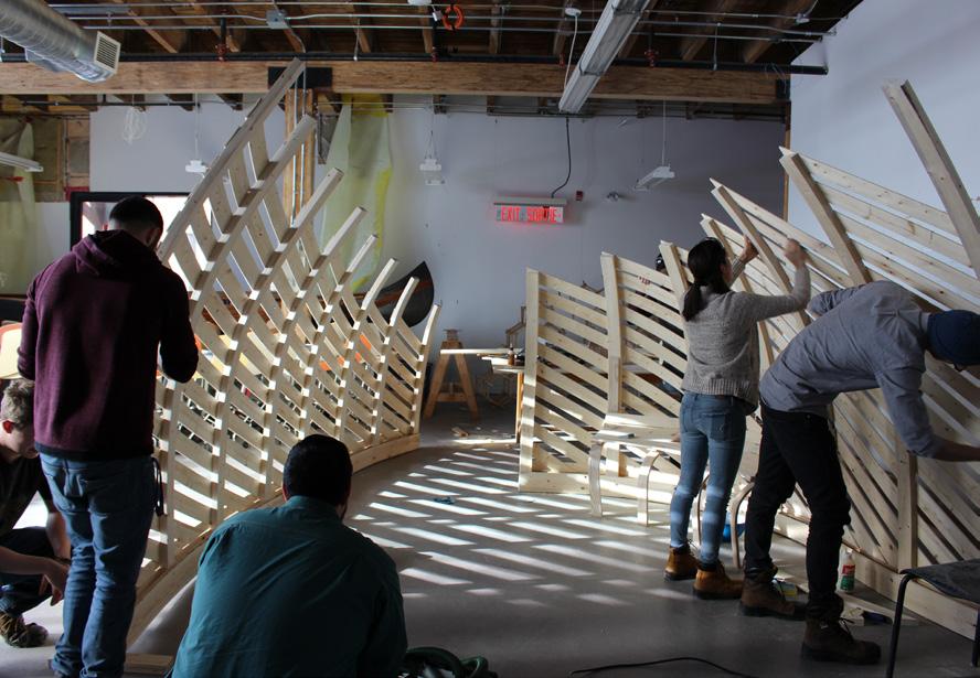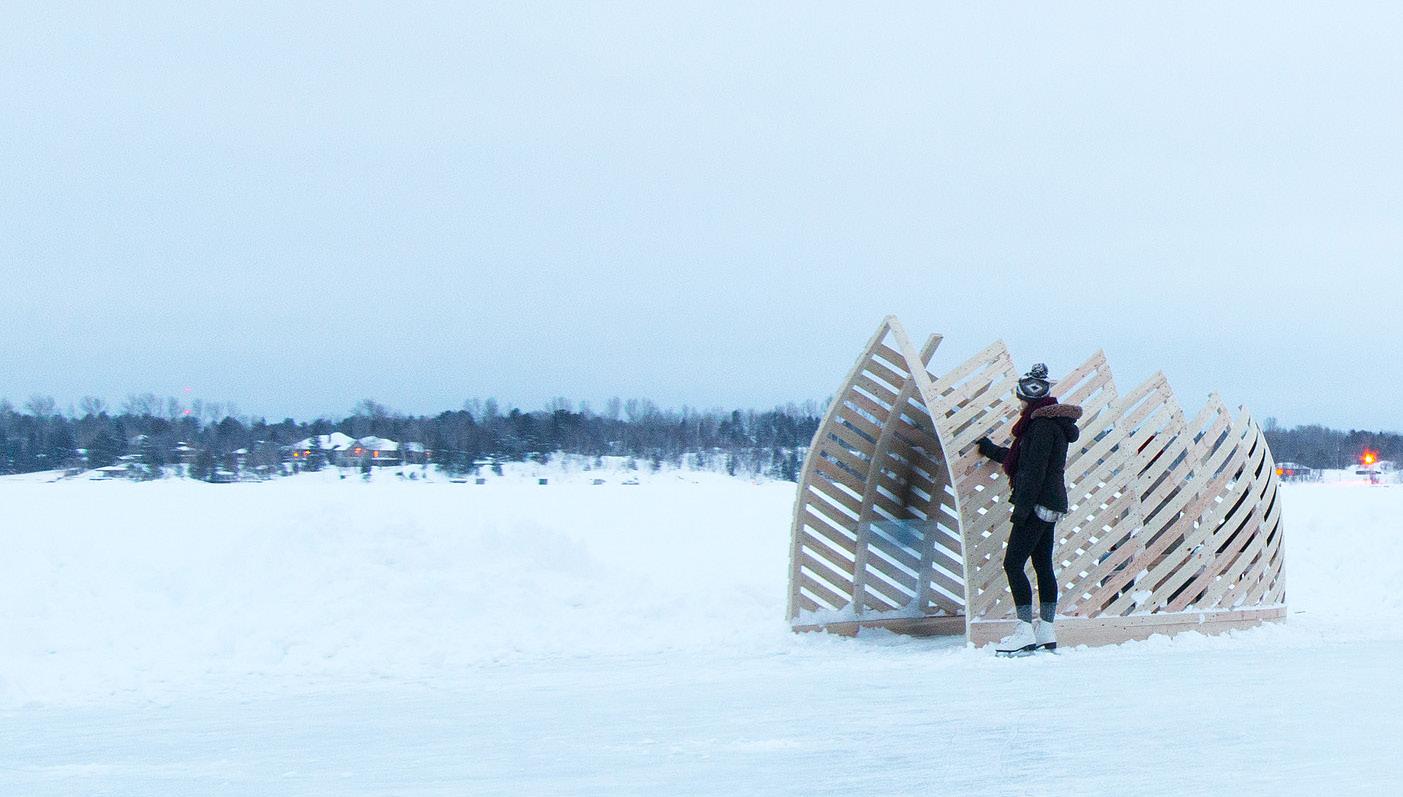 winter conditions and provides comfortable seating. To achieve the curves of this form, we explored two methods of wood bending, lamination and steam bending. This allowed us to create curves in both the horizontal and vertical planes of installation. The form of the ice station allows users to flow freely through, around the installation, or sit inside while enjoying the skating path.