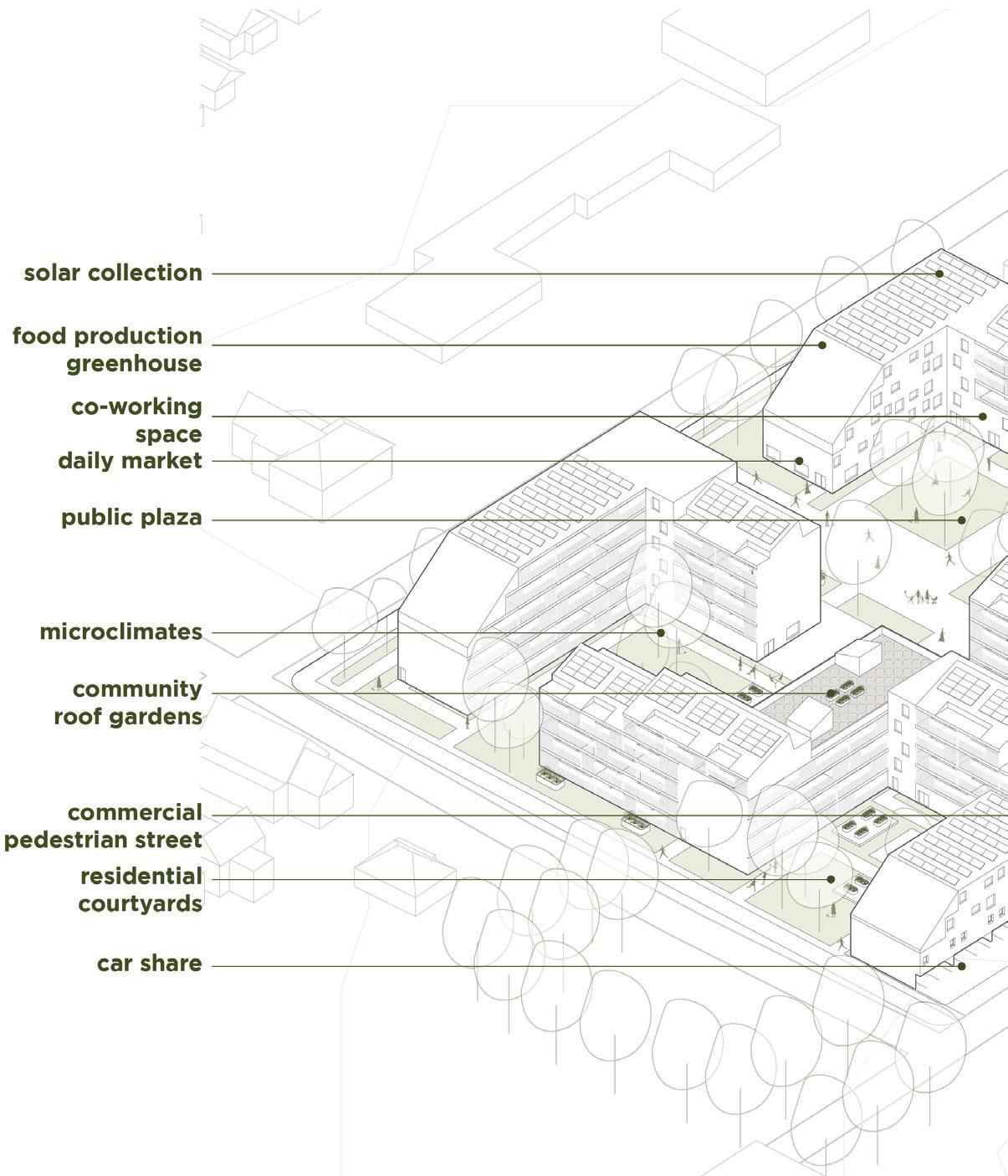 The design project is a place based design framework culminating from sustainable urban development strategies that emphasize user well-being and low carbon design which focus on systems and building eficiencies to reduce the overall and individuals carbon footprint.