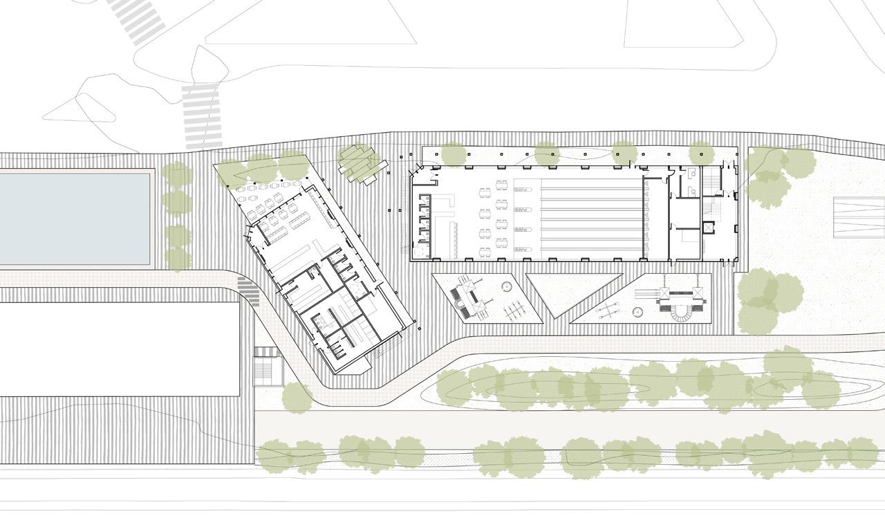 Ground floor plan indicating the commercial programming on site.