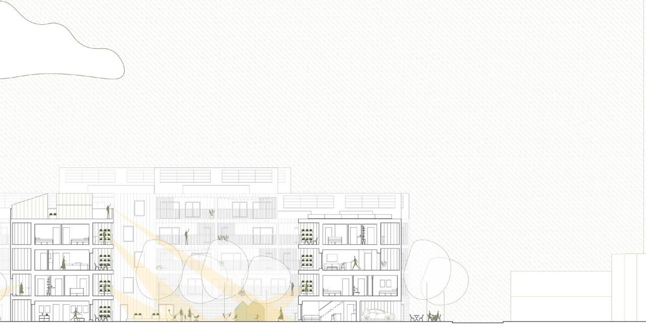 Sectional parti explores the relationship between public and private spaces to ensure there are comfortable spaces for residents and community members to gather.
