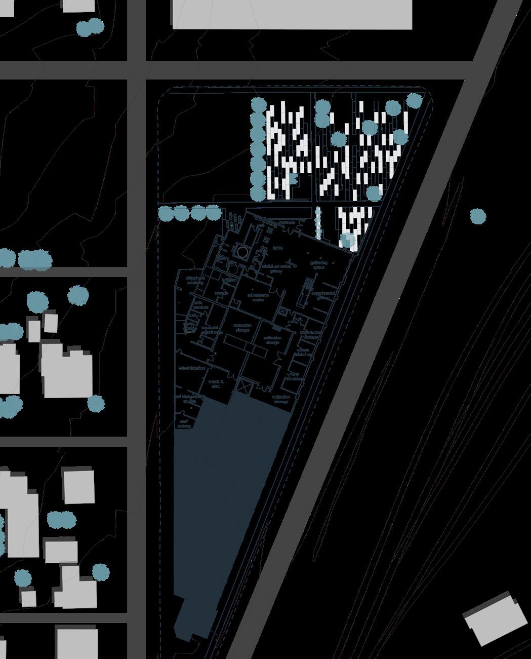Urban design plan including the ground floor plan for the market [2 buildings to the left], cafe [right], and bowling alley [far right].