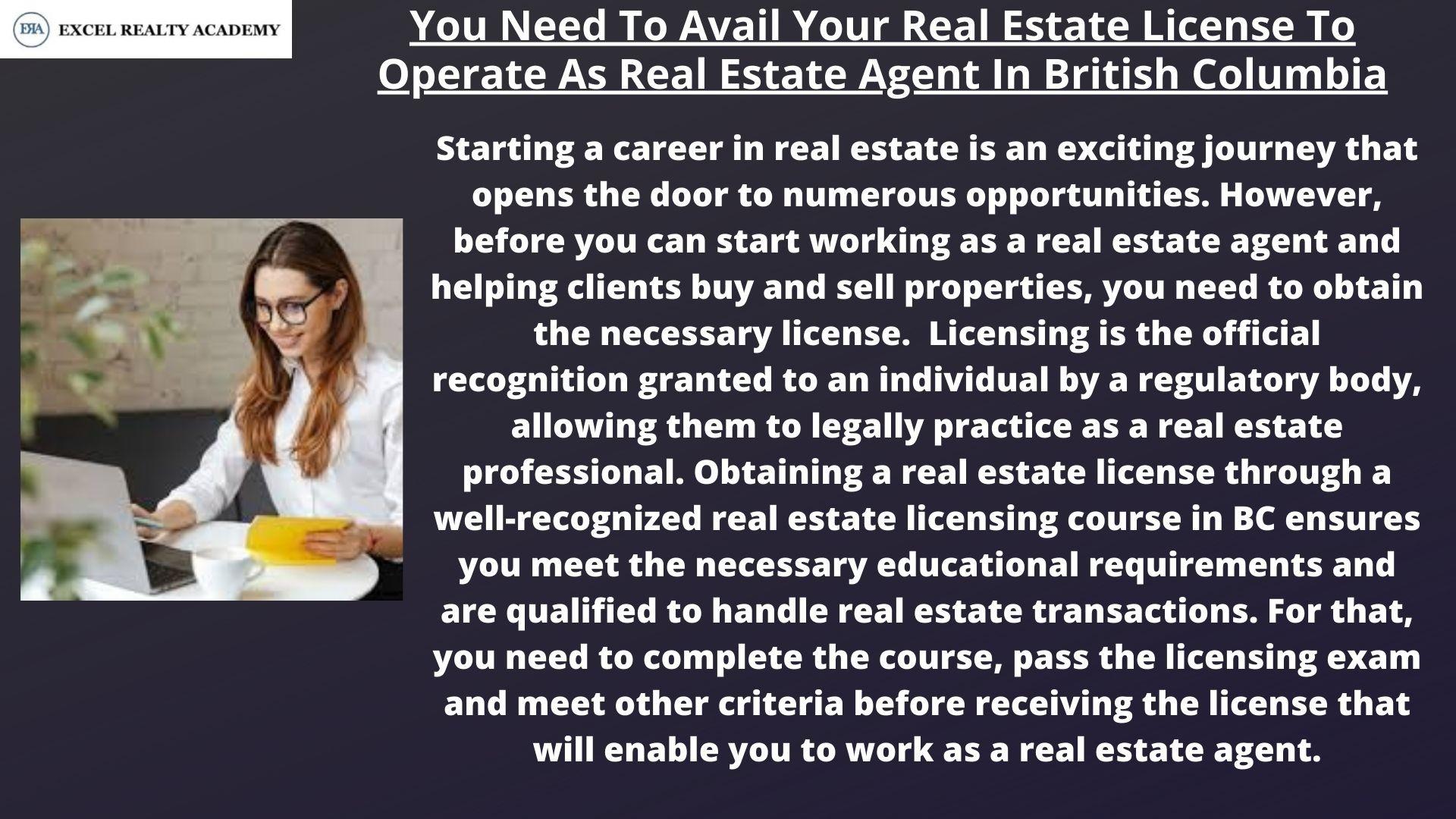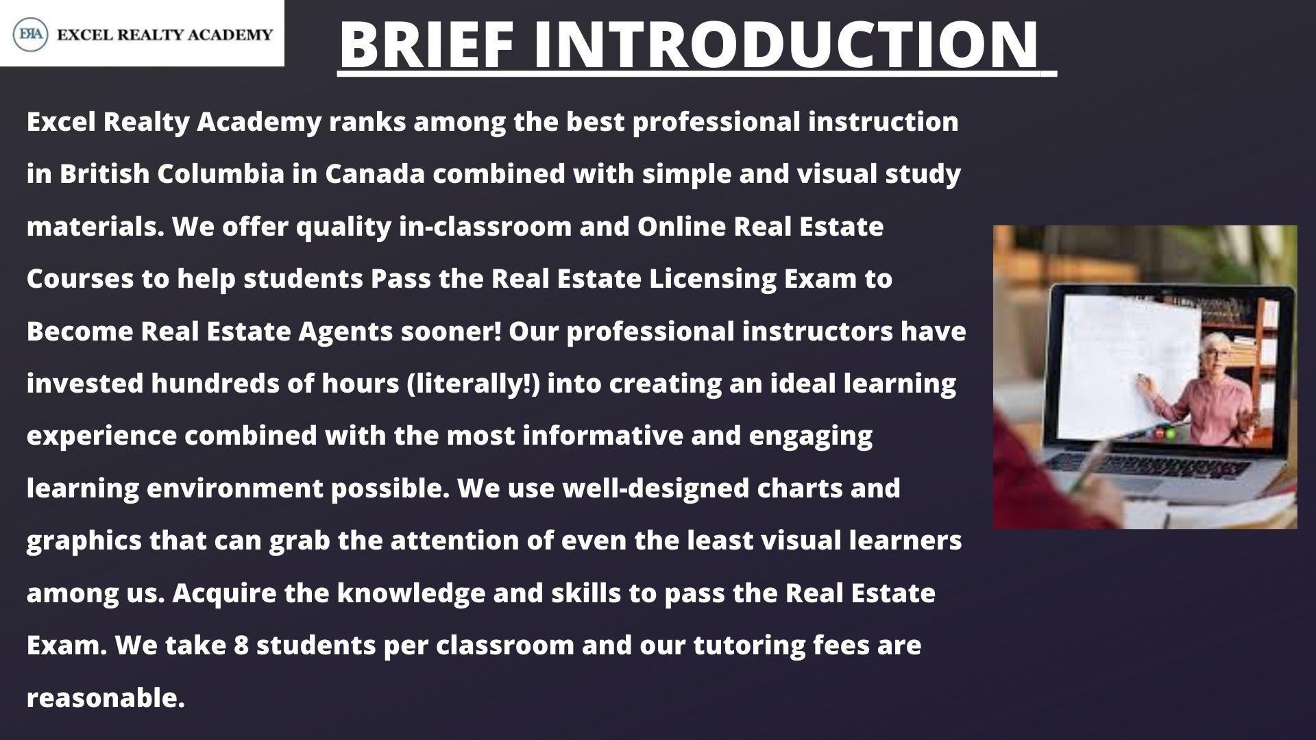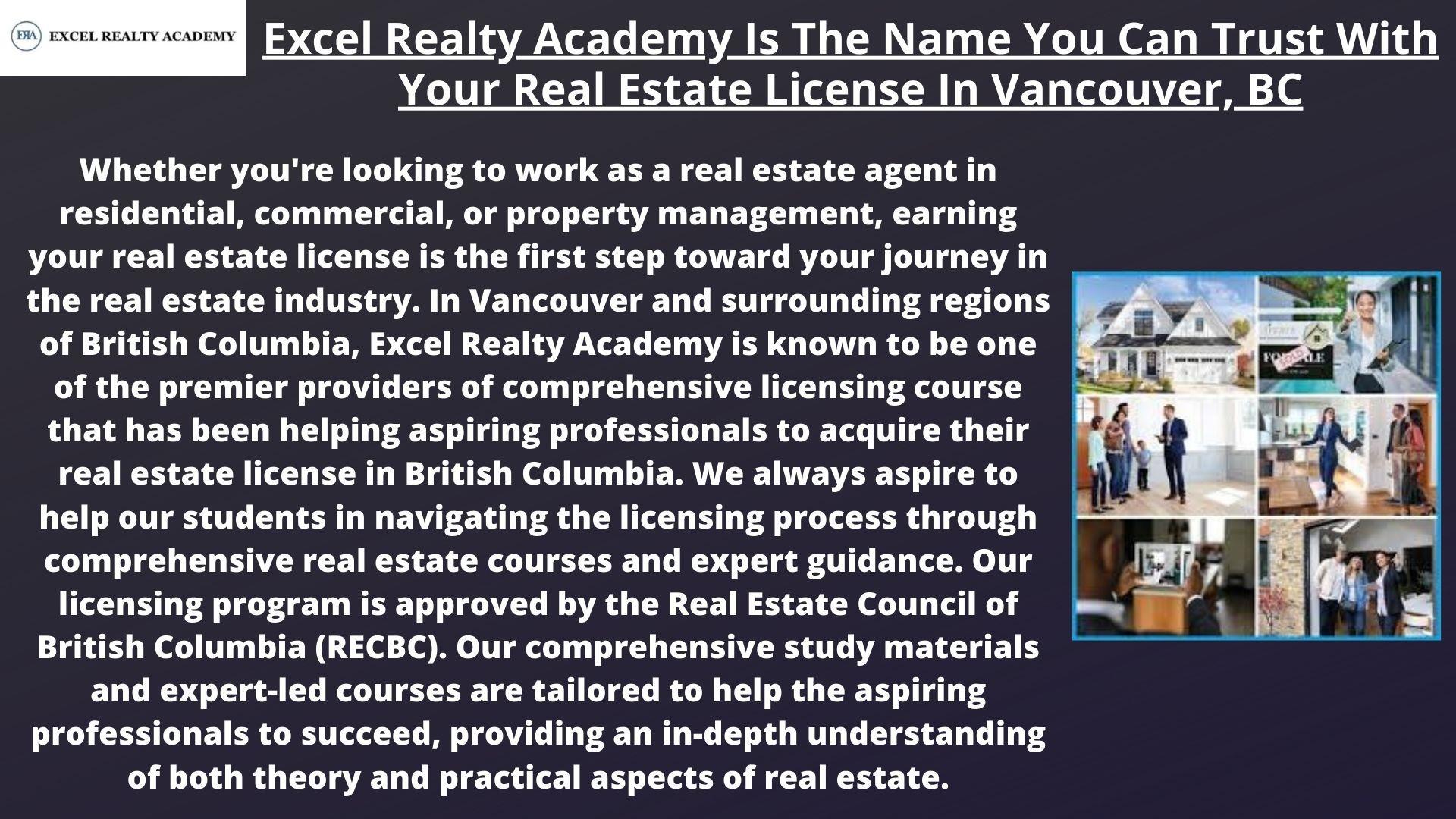 In Vancouver and surrounding regions of British Columbia, Excel Realty Academy is known to be one of the premier providers of comprehensive licensing course that has been helping aspiring professionals to acquire their real estate license in British Columbia. We always aspire to help our students in navigating the licensing process through comprehensive real estate courses and expert guidance. Our licensing program is approved by the Real Estate Council of British Columbia (RECBC). Our comprehensive study materials and expert-led courses are tailored to help the aspiring professionals to succeed, providing an in-depth understanding of both theory and practical aspects of real estate.