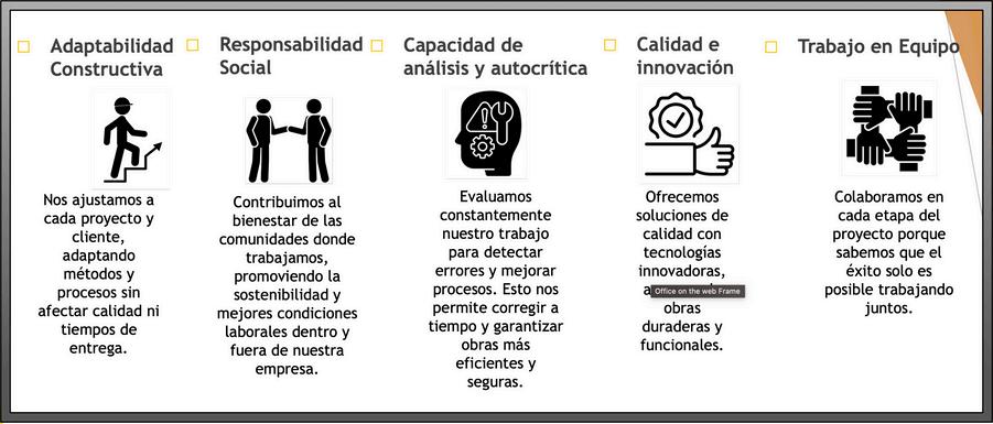 Los valores de esta empresa se basan en la adaptabilidad constructiva para enfrentar retos con flexibilidad, la responsabilidad social hacia la comunidad, la capacidad de análisis y autocrítica para mejorar continuamente, el compromiso con la calidad e innovación, y el trabajo en equipo como base para lograr objetivos comunes.