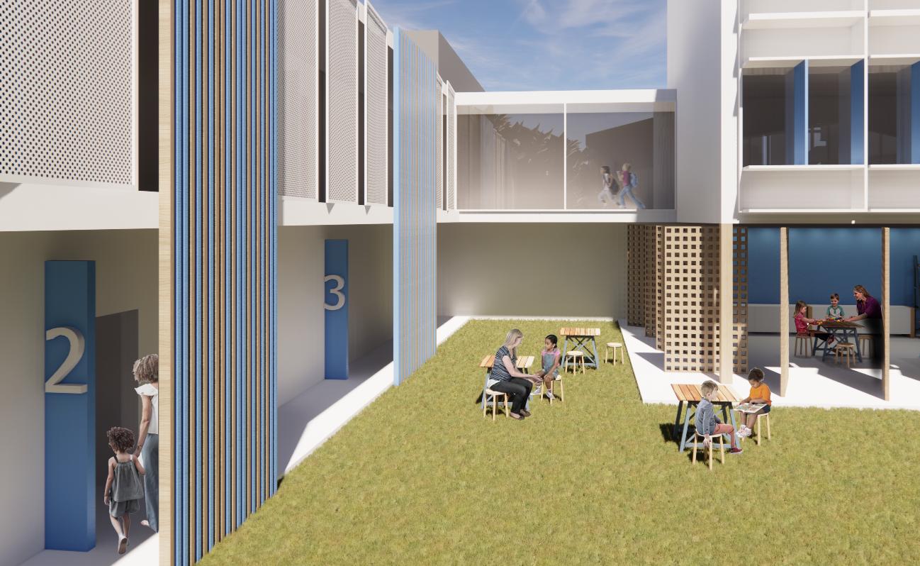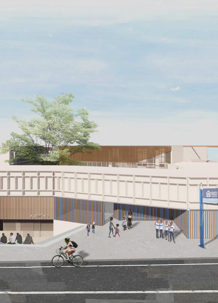 A implantação valoriza a relação da escola com a rua por meio de um recuo na fachada que amplia a calçada, dando mais conforto e convidando pedestres ao anexo de uso público da escola: o auditório. Localizado no subsolo, o auditório foi projetado para uso não apenas dos alunos mas também da comunidade do bairro, visando valorizar e incentivar o coletivo, dando espaço para eventuais reuniões, palestras e apresentações. Além disso, em frente as escadas de acesso ao subsolo, foi implantado uma tela que pudesse ser usada de maneira mais informal como reunir familias para assistir esportes ou eventos importantes.