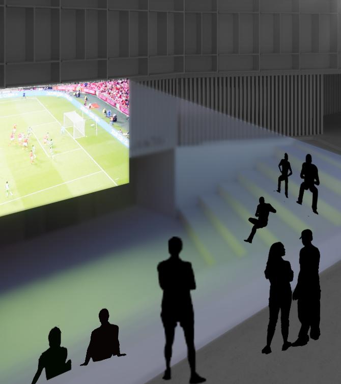 A distribuição desses espaços pelas fachadas do edifício seguem a lógica de “quebra” do térreo voltando atividades esportivas para um lado, e as de cultura e lazer para o outro.