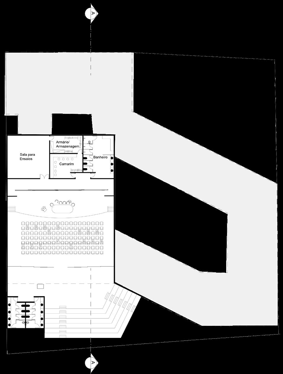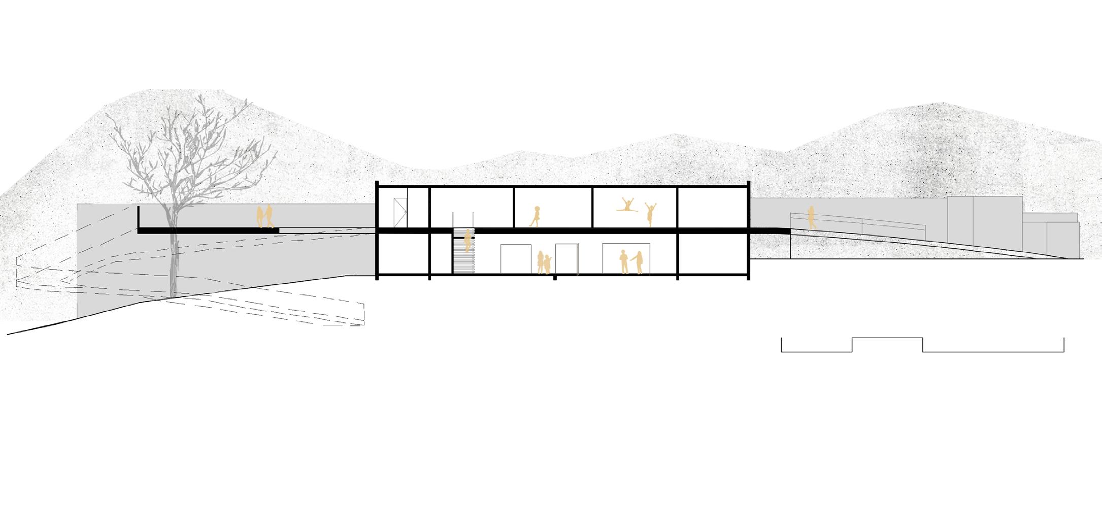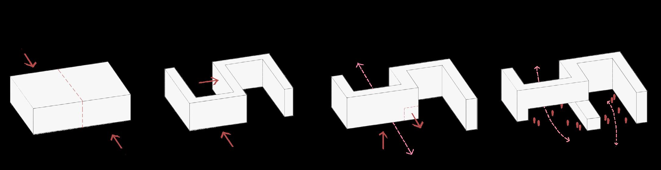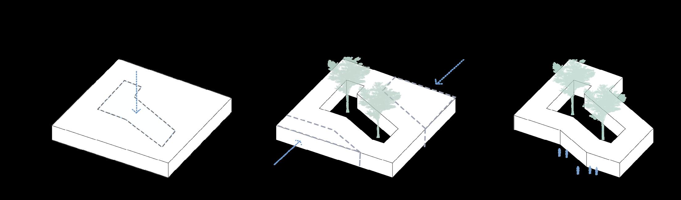 O projeto consiste em uma forma que se abre para as duas ruas paralelas ao terreno, convidando pedestres dos dois sentidos e, consequentemente, facilitando a ocupção e ativação do térreo. Esse, é dividido em dois pátios principais, cada um voltado para uma direção e com características diferentes, sendo o primeiro uma área mais ativa e de maior movimento, e o segundo um ambiente que funciona de maneira mais calma.