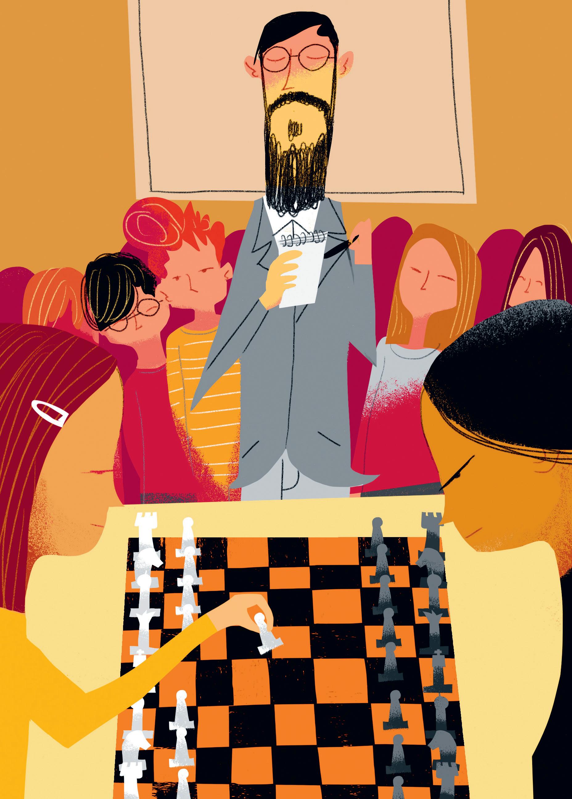 – Ho trovato la mia prima scacchiera nella soffitta di casa. Nessuno dei miei familiari sapeva giocare a scacchi e non ricordavano come fosse finita lì. Forse apparteneva a qualche trisnonno. Io ero un bambino molto timido, non riuscivo a farmi degli amici, passavo il tempo da solo a leggere. Avevo nove anni, esattamente la vostra età, e per me quell’oggetto era molto affascinante; volevo assolutamente capire come funzionava. Così sono andato su internet e ho imparato le regole su un sito per principianti. Facevo delle partite in cui sfidavo me stesso, ma presto sentii il bisogno di affrontare dei veri avversari. Sempre navigando in internet scoprii che nella mia città c’era un circolo di scacchisti aperto ad appassionati di tutte le età. Ho lottato con la mia timidezza e le mie paure da un lato e con la passione per quel gioco dall’altro. Così ho trovato il coraggio che non pensavo di avere e ho chiesto ai miei genitori di iscrivermi. Loro sono stati contenti che avessi voglia di uscire dal mio guscio e di confrontarmi con altri bambini e hanno subito accettato. Andavo tutte le domeniche mattina, dovevo