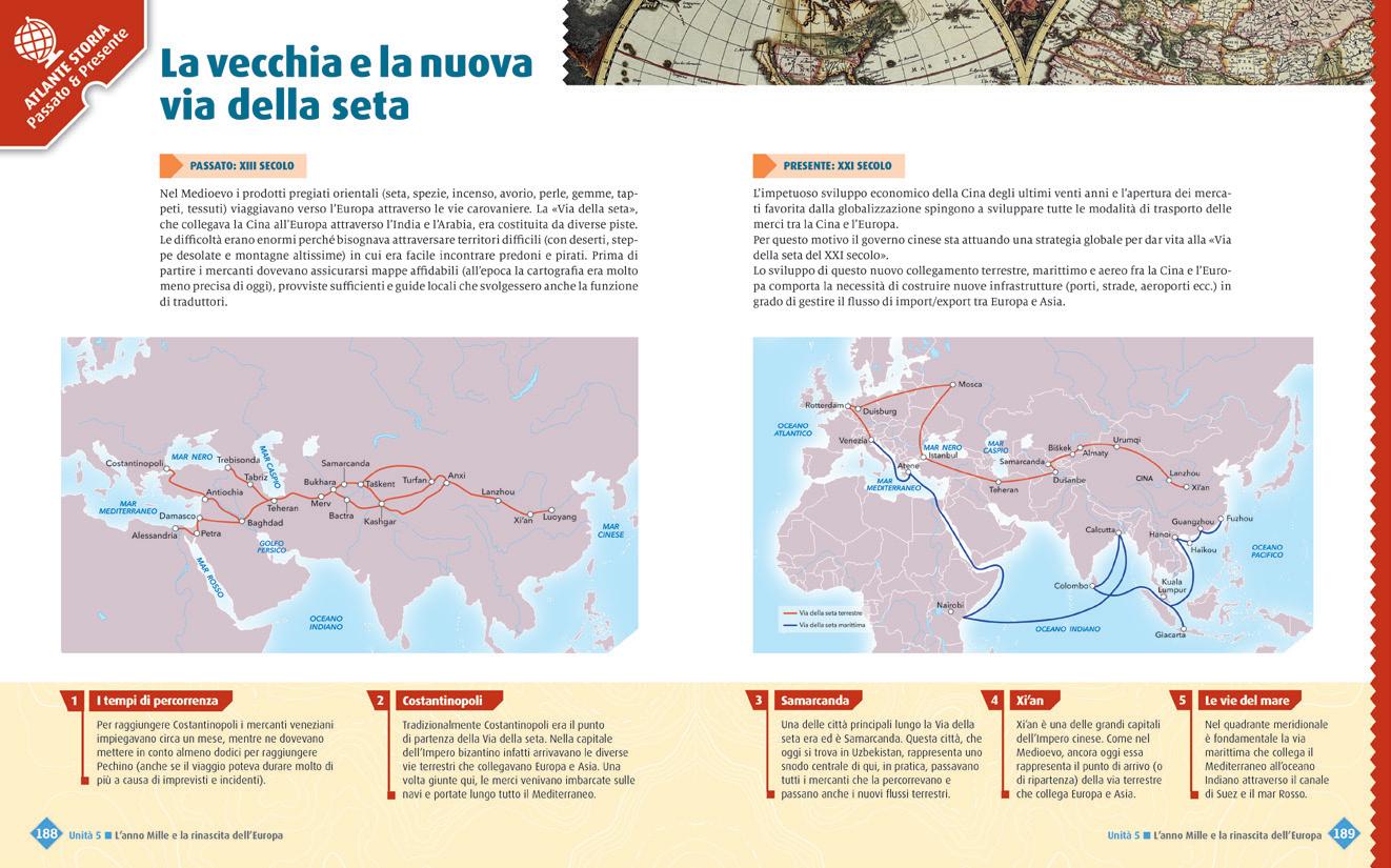 Le Unità si aprono con una doppia pagina che introduce e anticipa le tematiche che verranno trattate. Il testo sintetizza i concetti salienti ed è di supporto alla lettura dell’ampia cartina, arricchita da brevi testi con tiranti per un primo approccio geostorico. La linea del tempo ordina gli eventi in modo chiaro e consequenziale, accompagnata da immagini significative per una prima memorizzazione visuale.