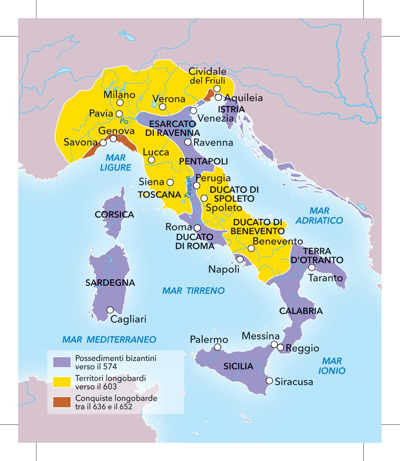 Come puoi osservare sulla carta, i Longobardi occuparono l’Italia settentrionale e buona parte dell’Italia centromeridionale, dove vennero stabiliti i ducati di Spoleto e di Benevento. I territori rimasti ai Bizantini risultavano più frammentati rispetto a quelli longobardi. I Bizantini chiamarono «Romània» la regione dove sorgeva la loro capitale, Ravenna, per sottolineare l’appartenenza di quel territorio all’Impero romano. Da quel nome deriva quello dell’attuale Romagna.