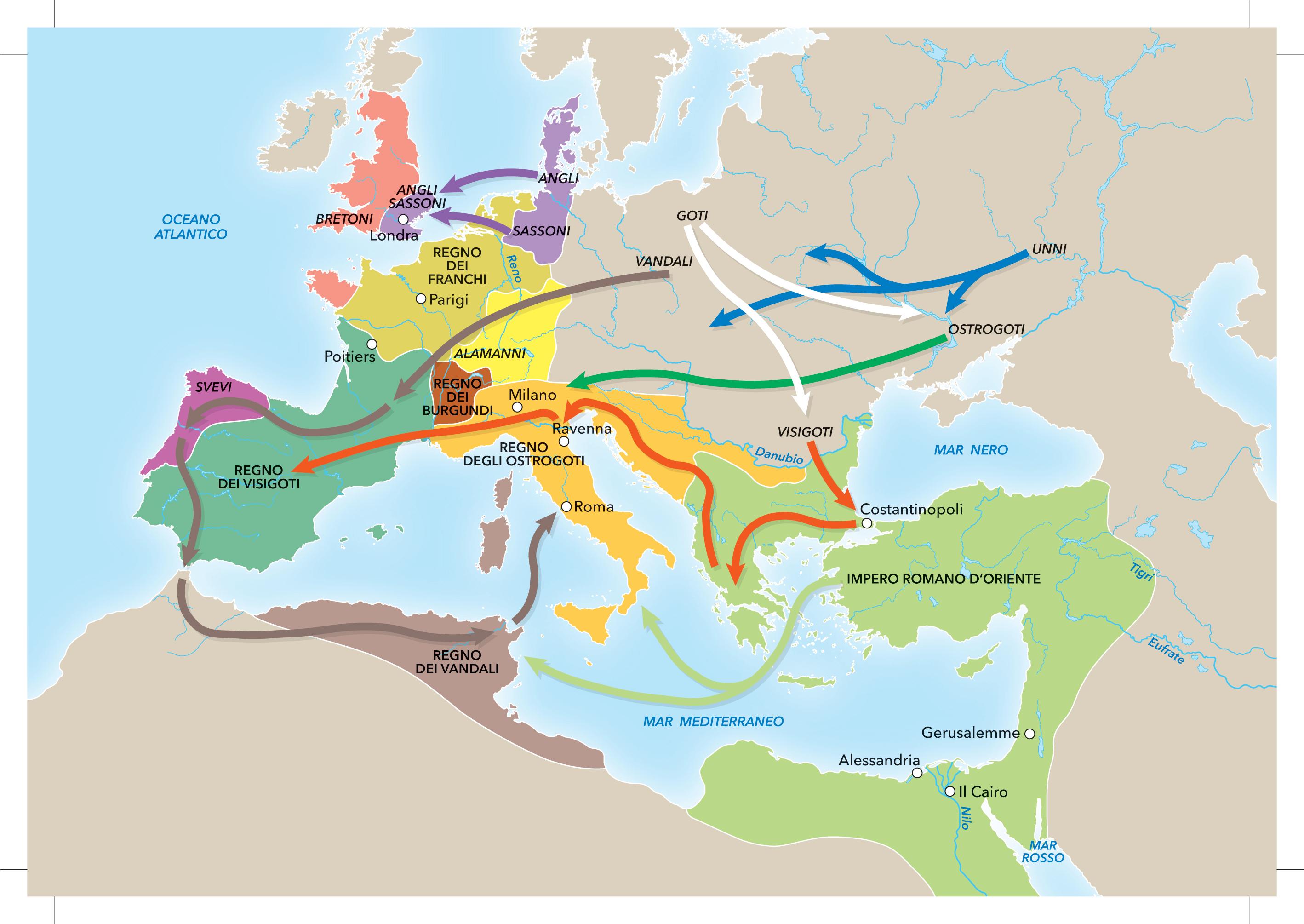 2. Completa la carta, colorando con diversi colori i territori europei da cui provenivano le principali popolazioni germaniche (Angli, Sassoni, Alamanni, Burgundi, Goti, Vandali).