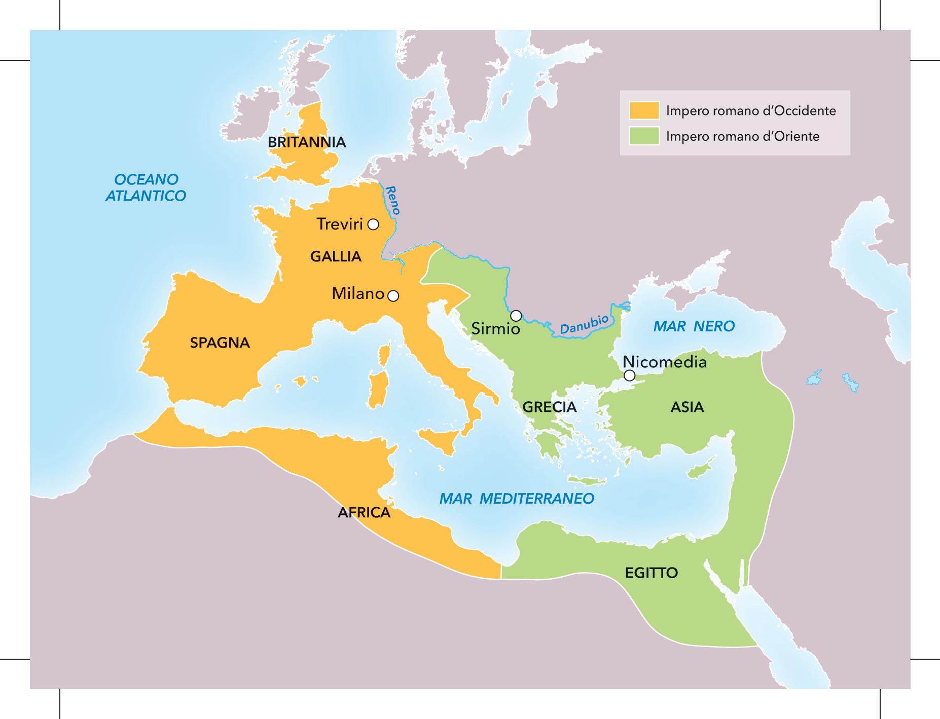 Nel 395, poco prima di morire, l’imperatore Teodosio divise l’Impero romano in due: la parte occidentale (con 30 milioni di abitanti) venne affidata al figlio Onorio, quella orientale (con 40 milioni di abitanti) all’altro figlio Arcadio. Dalla fine del IV secolo in avanti, l’impero rimase diviso e non fu mai più unificato.
