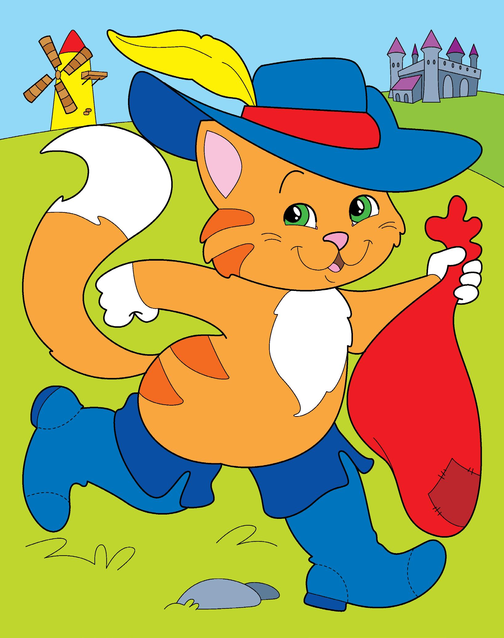 IL RAGAZZO OBBEDÌ E FECE AVERE AL GATTO QUANTO AVEVA CHIESTO. IL GATTO, INDOSSATI GLI STIVALI, ANDÒ NEL BOSCO, CATTURÒ DUE CONIGLI, LI MISE IN UN SACCO E SI RECÒ IN VISITA DAL RE.