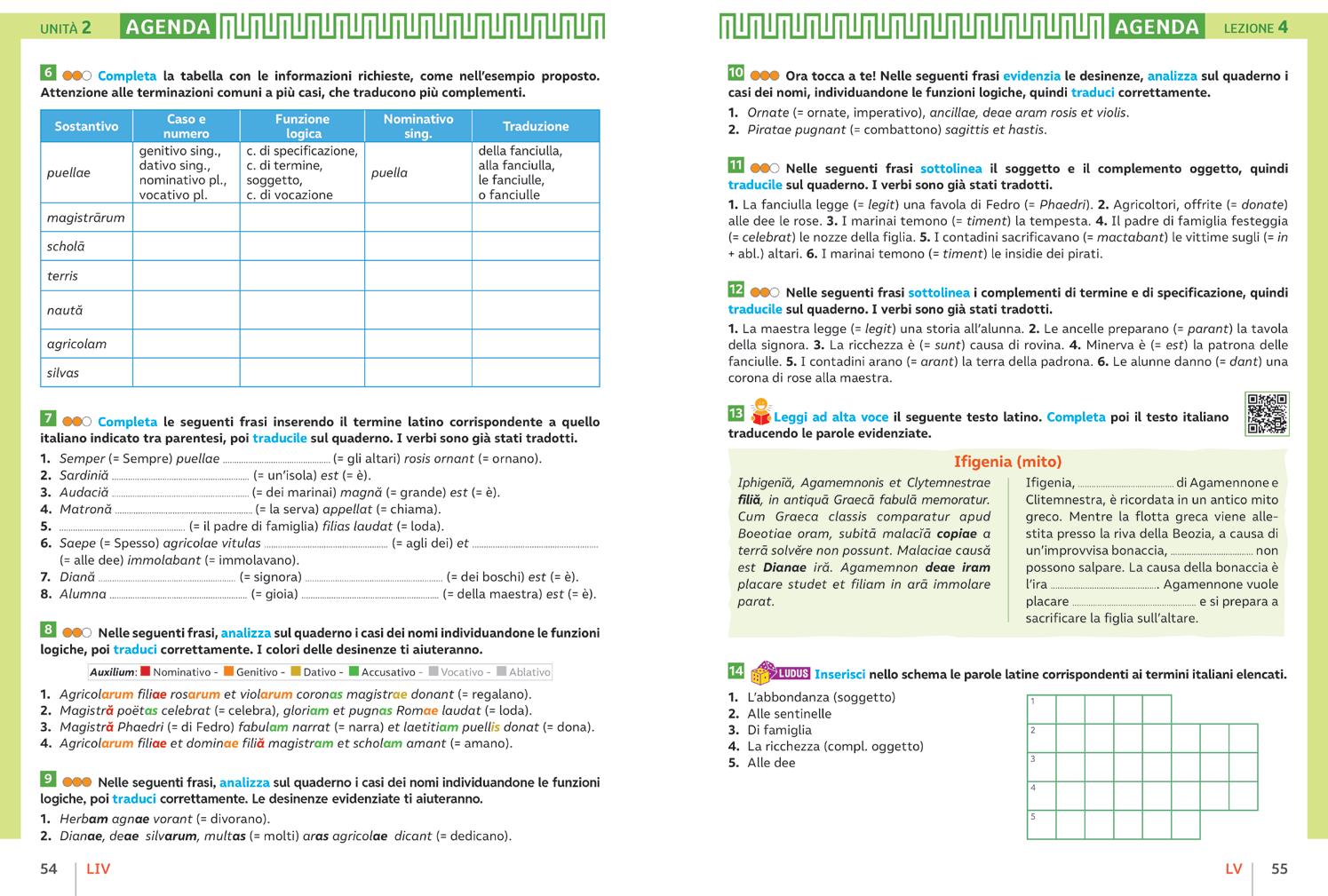 Gli esercizi hanno tre livelli di difficoltà e per alcune traduzioni è fornito un Auxilium (aiuto), una legenda a colori che ti guiderà nel riconoscere più facilmente i casi delle declinazioni