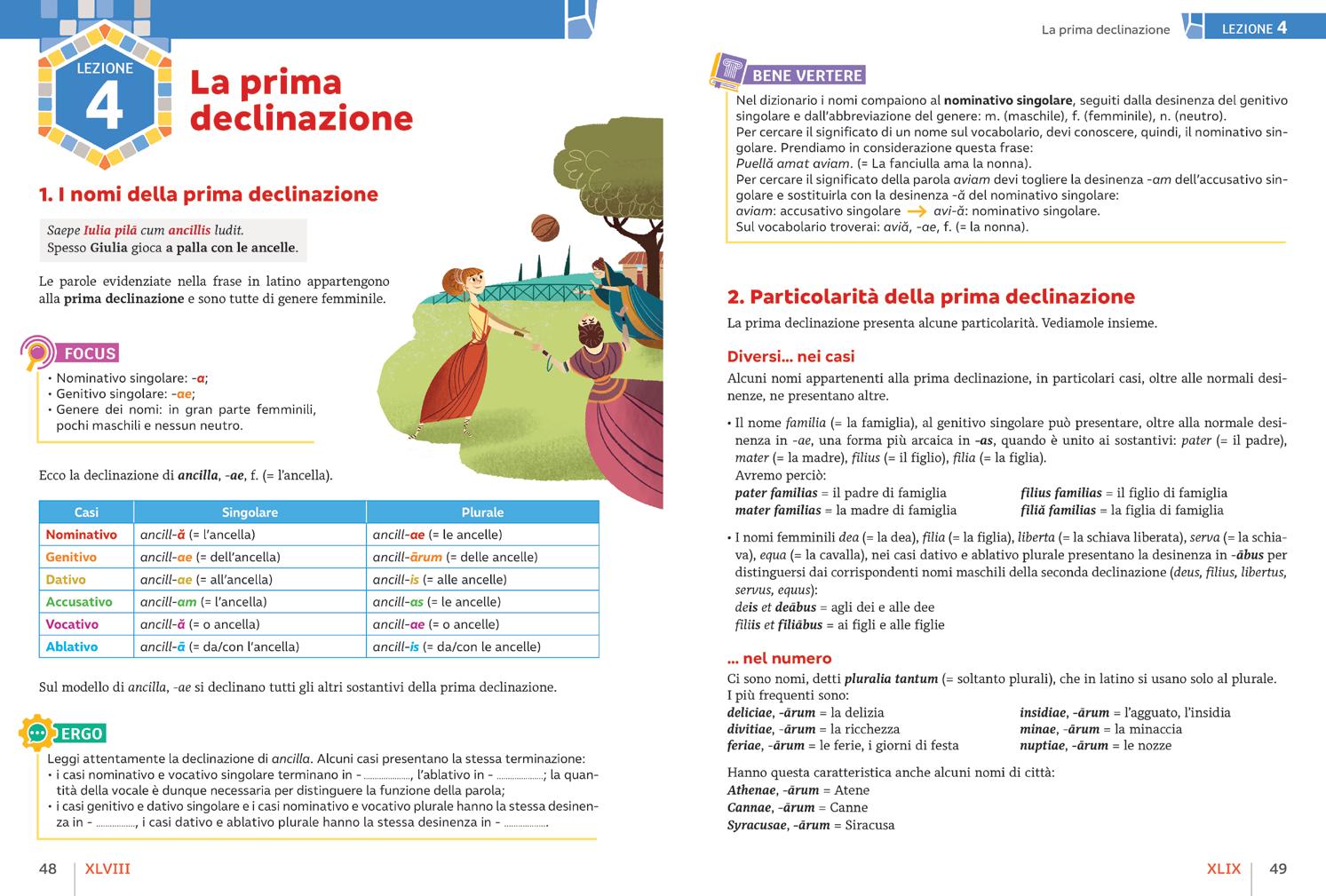 Nelle pagine di teoria, i casi delle declinazioni sono classificati con colori diversi, per facilitarne la memorizzazione.