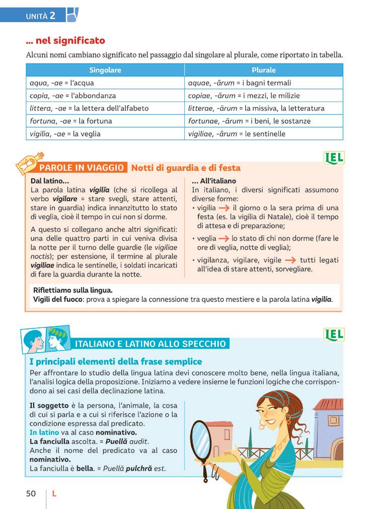Spunti di LEL (Latino per l’Educazione Linguistica): - confronto costante tra italiano e latino; - approfondimenti lessicali; - comparazione di alcuni termini nelle principali lingue neolatine; - civiltà e patrimonio culturale; - sezione dedicata all’epigrafia.