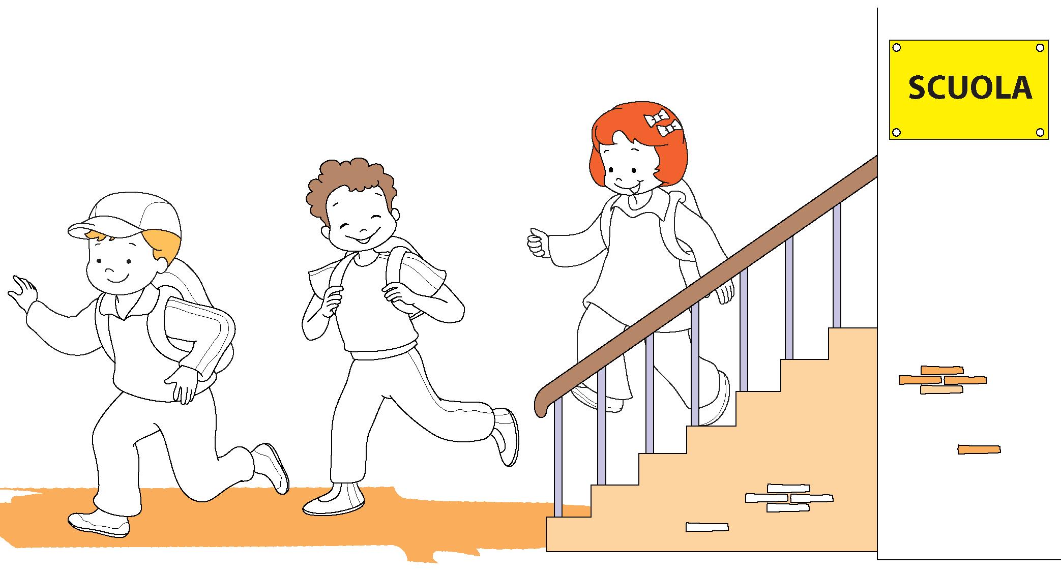Carletto è molto contento di ritornare a scuola. Lo accompagnano la mamma e il nonno Luigi. Davanti al portone ci sono bambini grandi e piccoli che mostrano agli amici gli zaini nuovi e colorati.