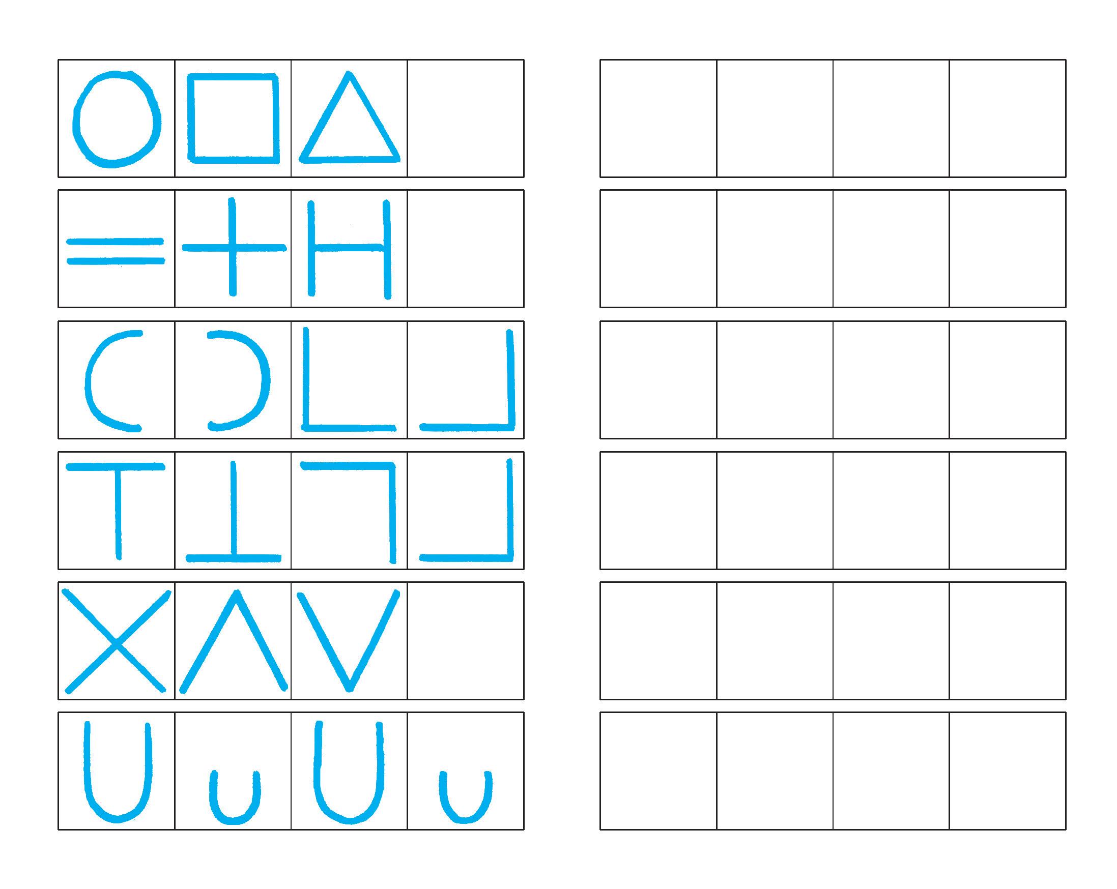 COPIA A MATITA LE FIGURE E LE FORME NEI QUADRETTI VUOTI A FIANCO.