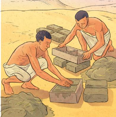 Le case dei Sumeri sono costruite con mattoni di argilla, un tipo di terra che viene dal fango dei fiumi (1); l’argilla si mescola con la paglia (2) e l’impasto ottenuto viene premuto negli stampi (3) e seccato al sole (4).