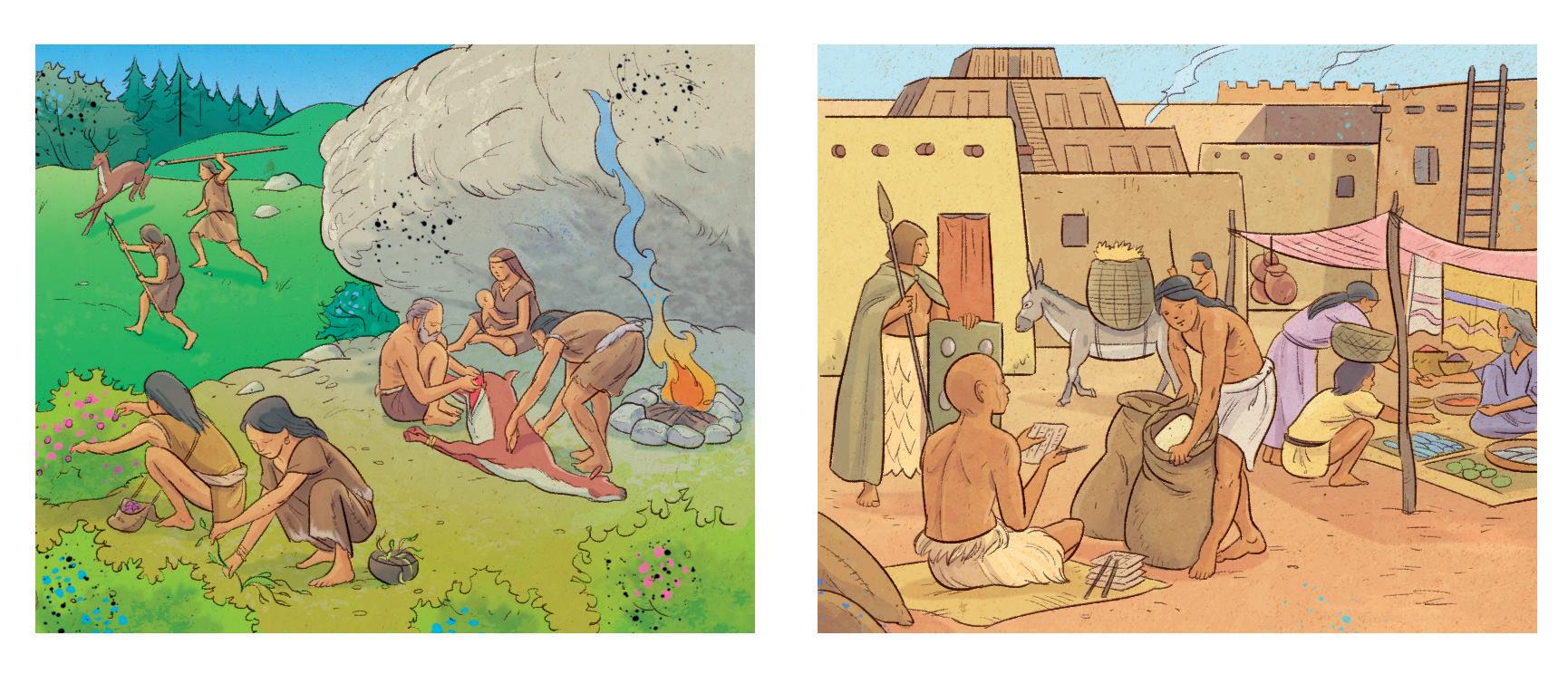 La Preistoria è il periodo in cui non esiste ancora la scrittura; uomini e donne vivono di caccia e di raccolto, scoprono il fuoco e l’agricoltura li spinge a organizzarsi nei primi villaggi. La Storia inizia con la scrittura, cioè la ricostruzione di eventi basati sulle testimonianze scritte prodotte dalle persone.