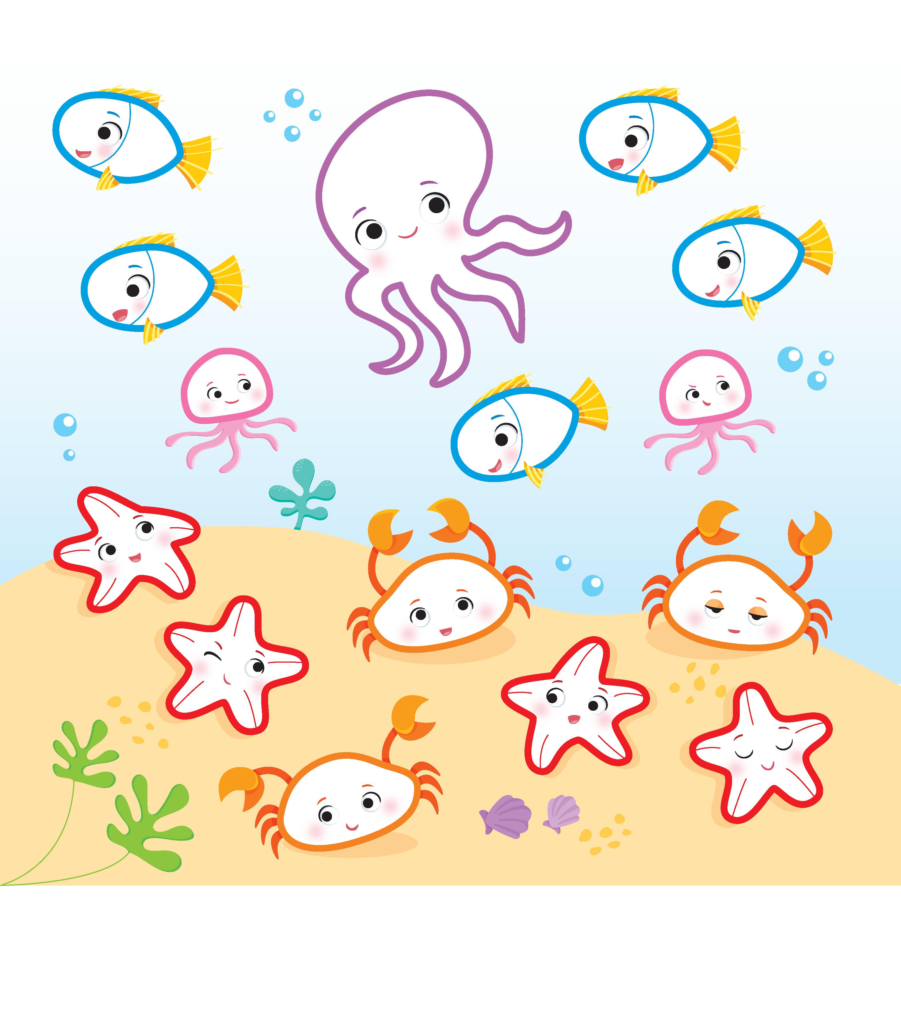 9 CONTO Conta e colora 0 polpi, 1 medusa, 2 granchi, 3 stelle marine e 4 pesci. IN FONDO