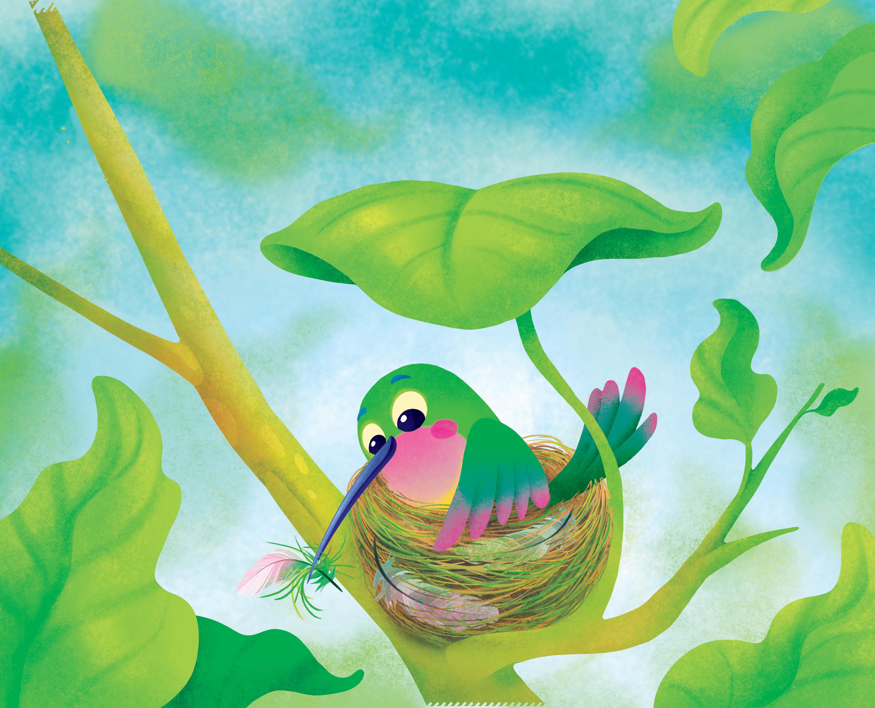 Colibrì decide di costruire il suo nido sopra un ramo di Albero Gigante. Ha bisogno di tante cose soffici.