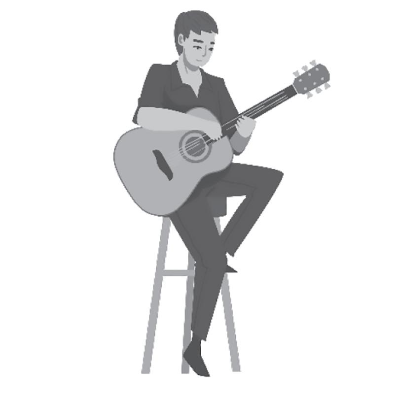 Read the sentences about what the students do at the school concert. Match the pictures (A-G) with the sentences (1-5). Write your answers in the boxes. There is one picture that you do not need. The first one (0) is an example.