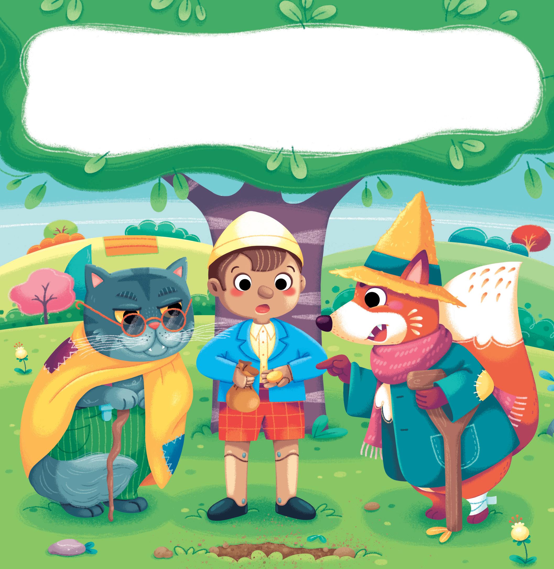 Il Gatto e la Volpe convincono Pinocchio a seppellire le monete d’oro, promettendogli che si sarebbero moltiplicate... invece lo derubano e lo appendono a un albero. La Fata Turchina lo salva, ma a causa delle bugie che racconta, il suo naso si allunga a dismisura.