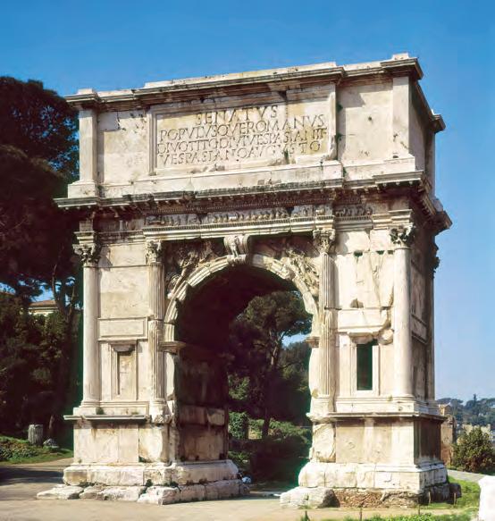 Arco di Tito, 90 d.C., marmo, 15,4 × 13,5 m. Roma, Foro Romano. Terminato nove anni dopo la morte dell’imperatore, l’arco è stato eretto per ricordare la vittoria di Tito nella guerra giudaica, celebrata con un trionfo nel 71 d.C.